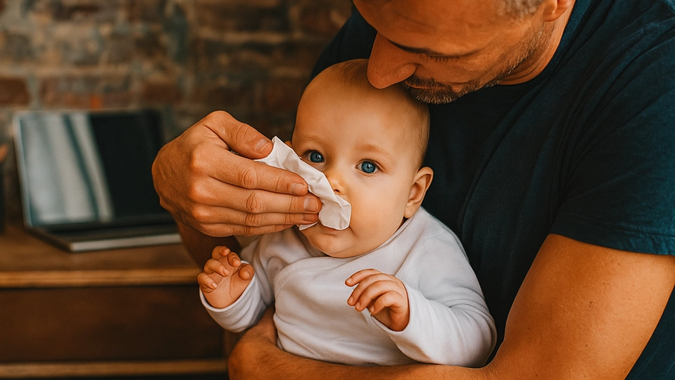 Χρησιμοποιήστε ειδική παιδική αναρροφητική συσκευή εκκρίσεων. Βοηθά επίσης η ύγρανση του αέρα – για παράδειγμα, υπερηχητικοί υγραντήρες για το παιδικό δωμάτιο. Καθαρίζετε τακτικά τη μύτη με φυσιολογικό ορό και ενυδατώνετε την περιοχή γύρω από τα ρουθούνια με αλοιφή που περιέχει πανθενόλη.