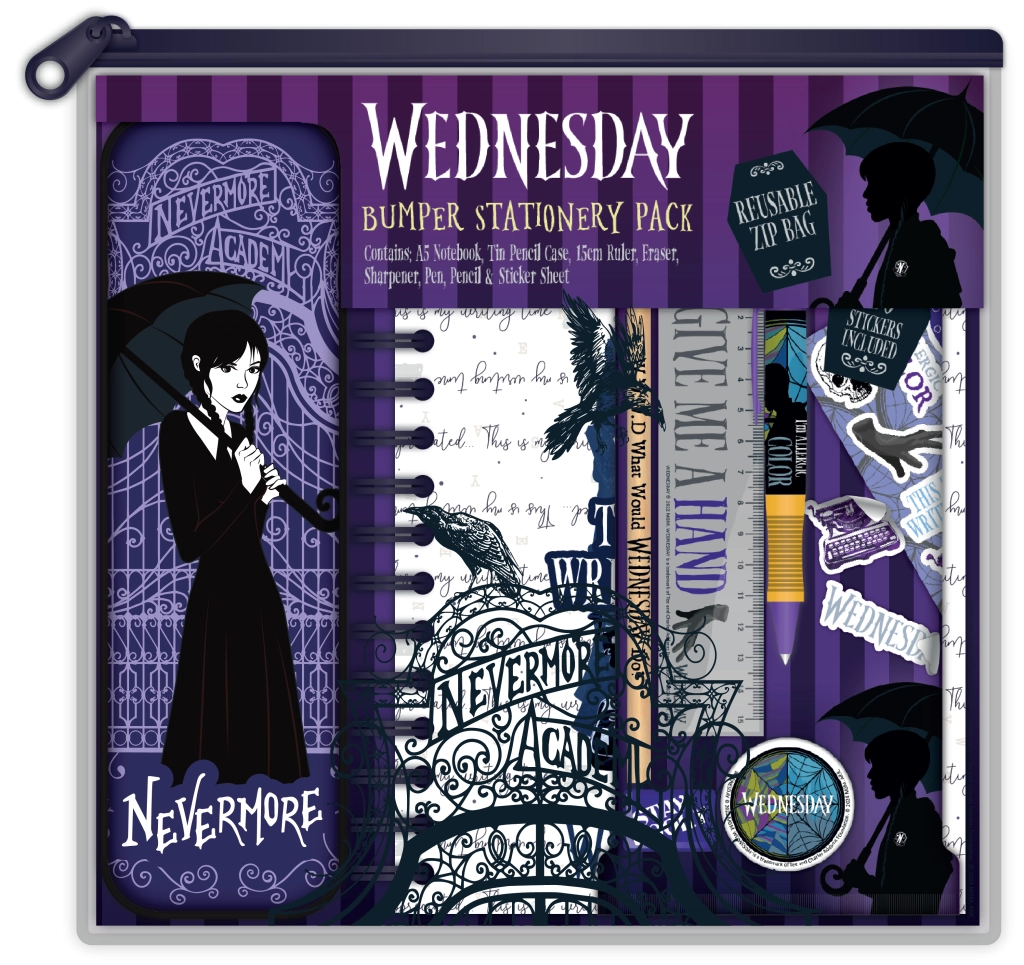 Εισέλθετε στον κόσμο της σκοτεινής κομψότητας του Nevermore – η κατηγορία Wednesday φέρνει αδειοδοτημένα παιχνίδια Wednesday εμπνευσμένα από τη Wednesday Addams και την οικογένεια Addams. Χάρη στον πρωτότυπο σχεδιασμό, την λεπτομερή κατασκευή και την ασπρόμαυρη-μοβ αισθητική, θα ενθουσιάσει κάθε fan που αναζητά στυλάτα και ποιοτικά δώρα.