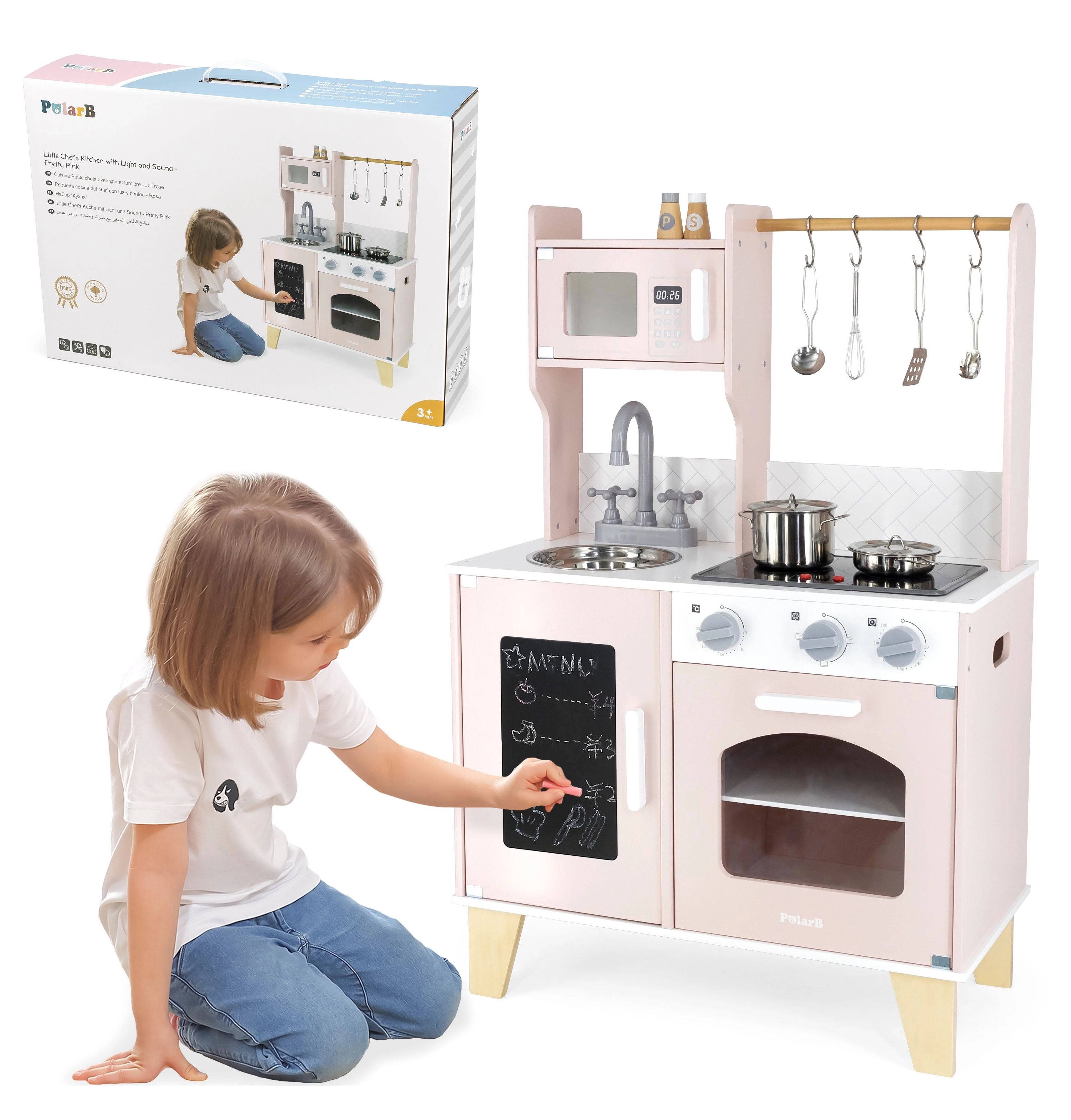 Κάθε παιδική κουζίνα εντυπωσιάζει με πλούσια αξεσουάρ: κατσαρολάκια και τηγάνια, μαχαιροπίρουνα, σετ τσαγιού και καφέ, μπαχαρικά, τρόφιμα κουζίνας και ποδιές για μικρούς σεφ. Πρακτικά στοιχεία όπως ράφια, αποθηκευτικά ντουλάπια, μαγνητικές πόρτες, πινακάκι για μενού ή ύψος πάγκου προσαρμοσμένο στα παιδιά διευκολύνουν την οργάνωση· θα εκτιμήσετε τα ανθεκτικά υλικά, την εύκολη συναρμολόγηση και τη μεγάλη αντοχή για καθημερινό «μαγείρεμα» στον κόσμο της φαντασίας.