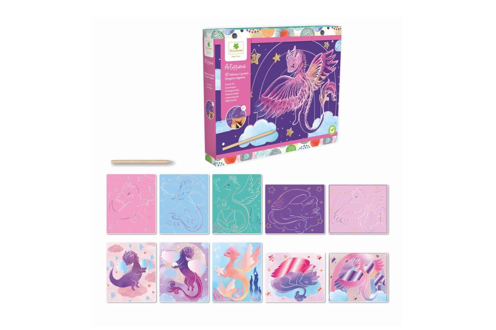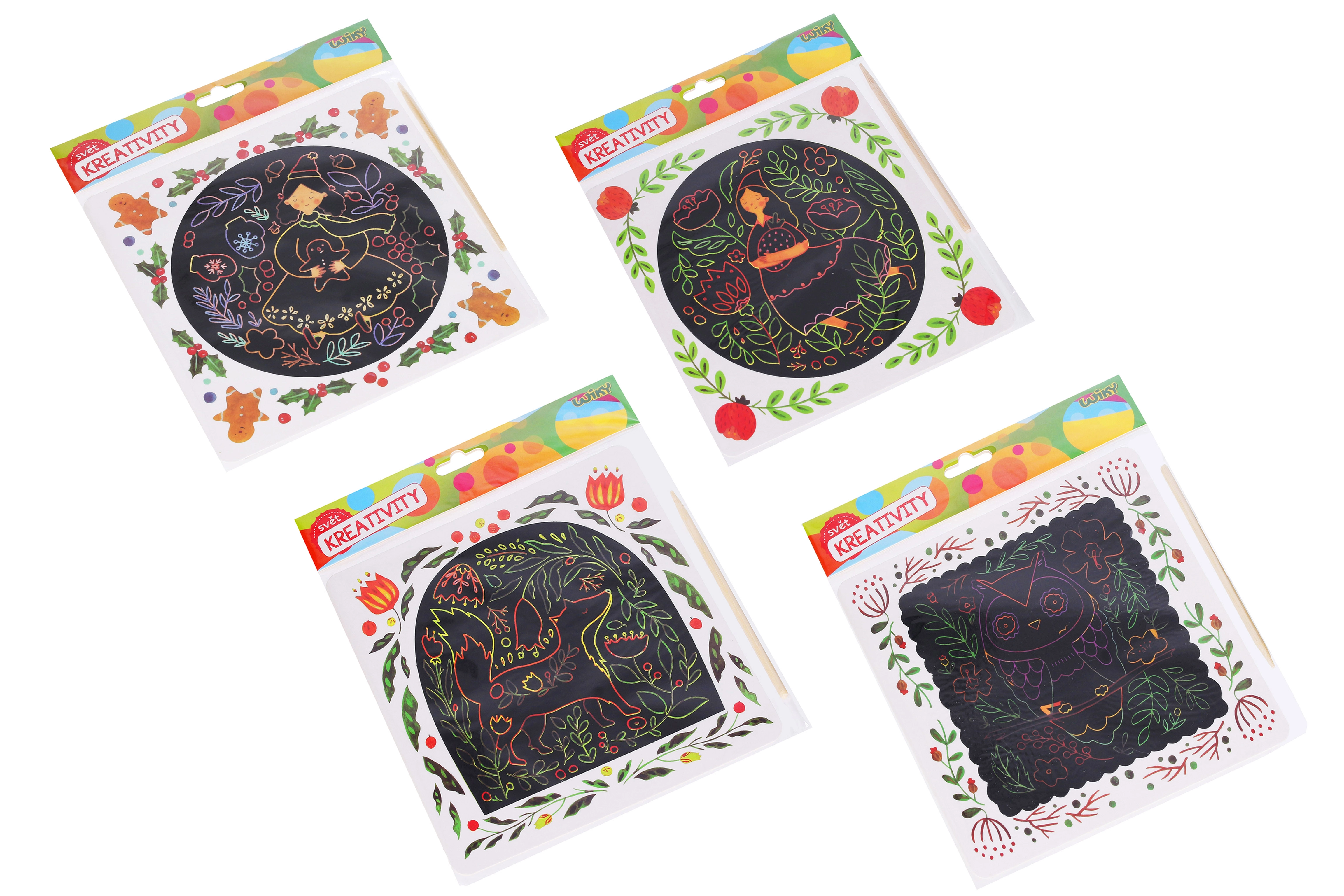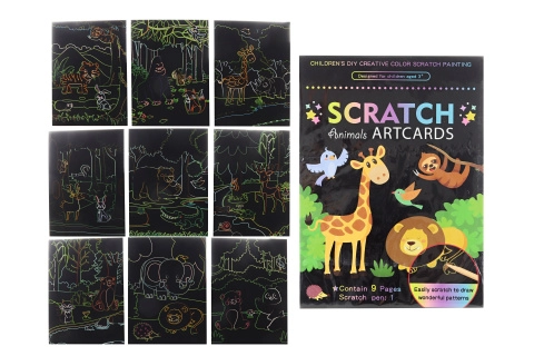 Κάτω από τη μαύρη επιφάνεια κρύβεται ένας πολύχρωμος κόσμος – με λίγες μόνο κινήσεις με τη γρατζουνίστρα δημιουργούνται μαγικά ξυστά σχέδια. Το Scratch art (ξυστά, αποξεόμενα σχέδια) ανήκει στα αγαπημένα δημιουργικά παιχνίδια και στα σετ χειροτεχνίας με εφέ ουράνιου τόξου, γκλίτερ και μεταλλικά, προσφέροντας γρήγορα αποτελέσματα. Τα σετ συνήθως περιλαμβάνουν ξύλινη γρατζουνίστρα, στένσιλ και πρότυπα· πάνω σε μαύρες κάρτες μεγέθους A5 ή A4 μπορείτε εύκολα να δημιουργήσετε μοτίβα με ζώα, δεινόσαυρους, μονόκερους, το διάστημα ή μάνταλα.