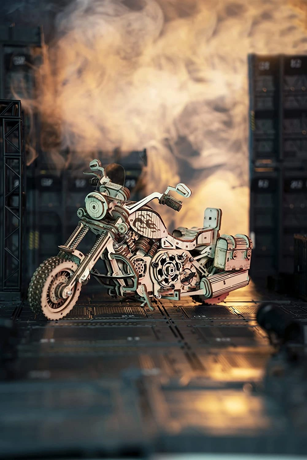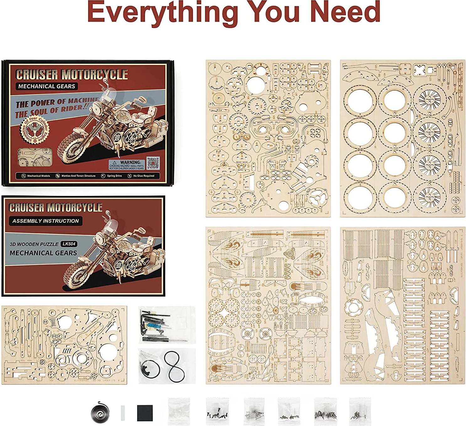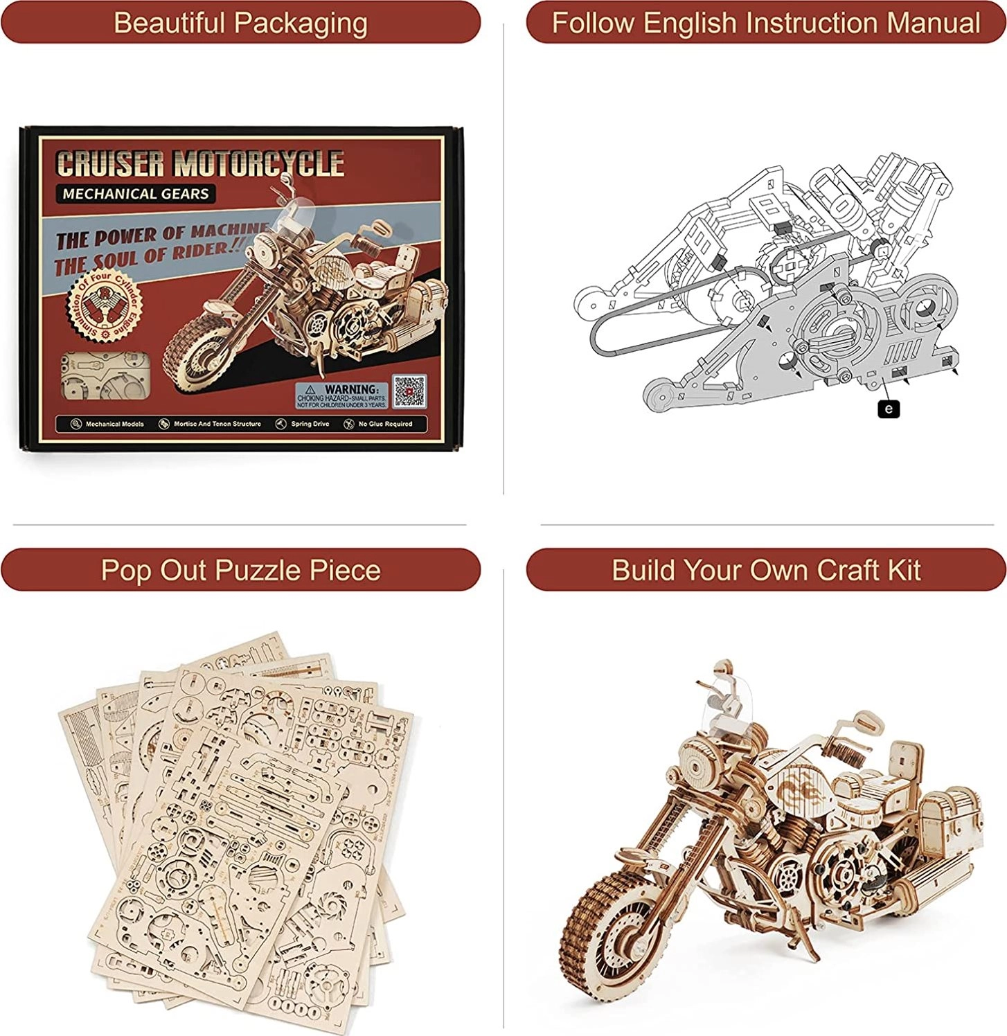 Ανακαλύψτε τη χαρά του μοντελισμού με αυτή την ακριβή 3D κατασκευή μοτοσικλέτας από κόντρα πλακέ. Το μοντέλο προσφέρει κουρδιστό ελατηριωτό μηχανισμό, λειτουργικό σύστημα διεύθυνσης, κινούμενα έμβολα και εργαζόμενη μπροστινή ανάρτηση. Με 420 κομμάτια και μεσαίο επίπεδο δυσκολίας θα απολαύσετε 4–5 ώρες διασκέδασης· μετά τη συναρμολόγηση η μοτοσικλέτα είναι ικανή για αυτόνομη κίνηση και εντυπωσιάζει με τον διακοσμητικό σχεδιασμό και τις μικρές αποθηκευτικές θήκες δίπλα στη σέλα.