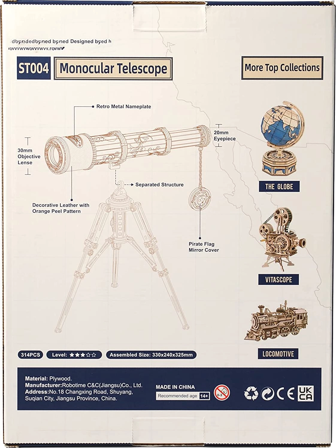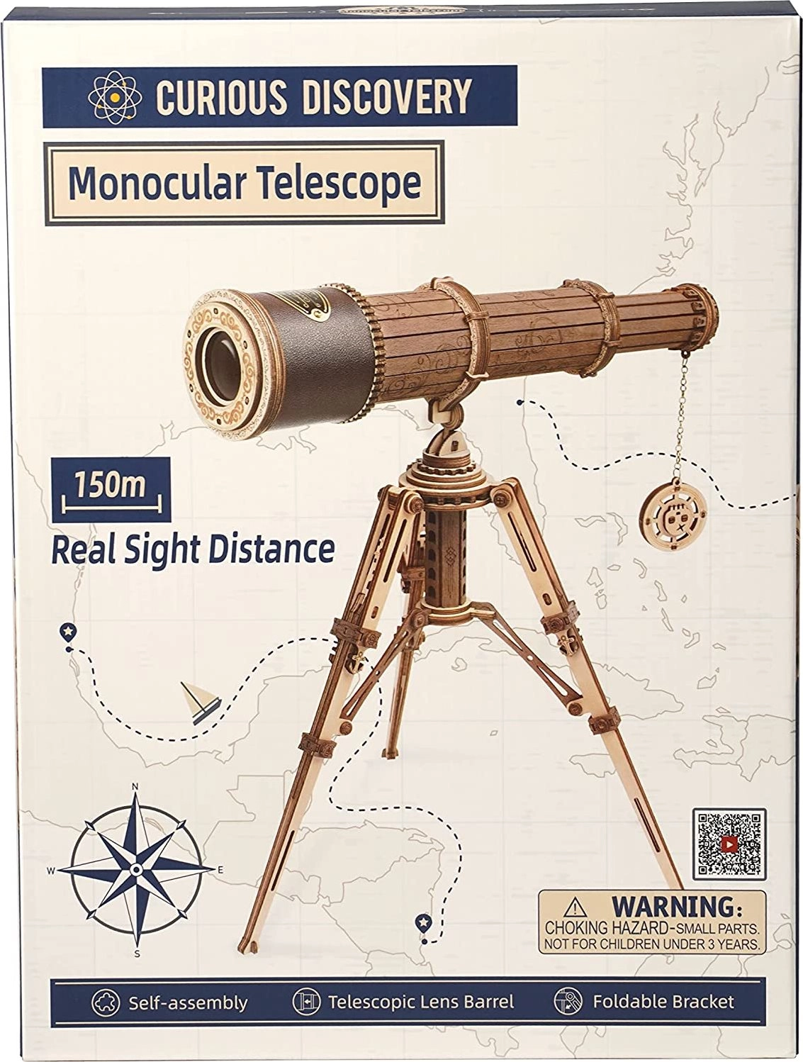 Ανακαλύψτε τη μαγεία της κατασκευής με το 3D ξύλινο μοντέλο του μονοκλιακού τηλεσκοπίου ROBOTIME Rokr. Αυτό το όμορφα διακοσμημένο τηλεσκόπιο προσφέρει τριπλή μεγέθυνση και πραγματική εμβέλεια παρατήρησης έως και 150 μέτρα, καθιστώντας το ένα ιδανικό διακοσμητικό αλλά και λειτουργικό στοιχείο.