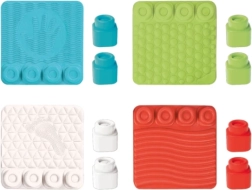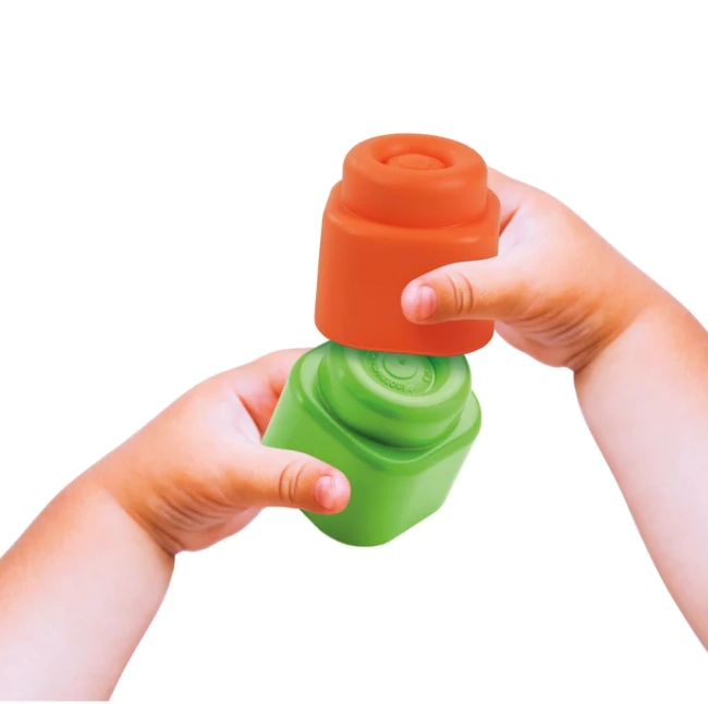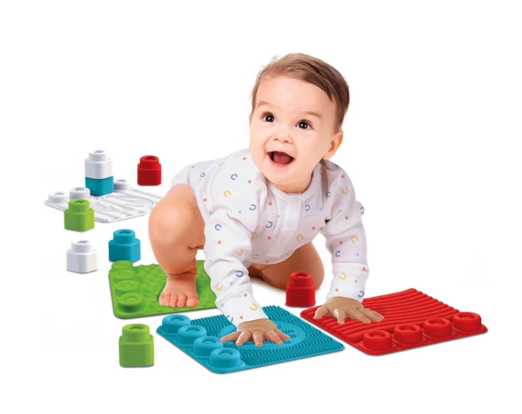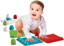 Κάθε πατάκι διαθέτει τέσσερις θέσεις για τουβλάκια, ώστε τα παιδιά να δημιουργούν χρωματικούς συνδυασμούς, να στοιβάζουν, να γκρεμίζουν και να ξαναχτίζουν. Το μαλακό, δοκιμασμένο και μη τοξικό υλικό είναι ασφαλές για την παιδική εξερεύνηση και συντηρείται εύκολα: πατάκια και τουβλάκια πλένονται στο πλυντήριο πιάτων έως 30 °C.