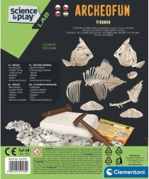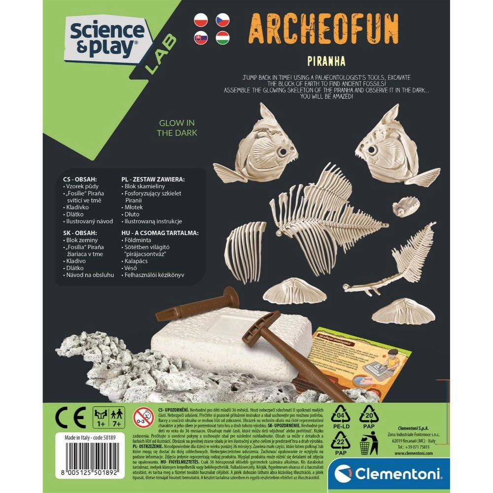 Γίνετε μικρός παλαιοντολόγος και ανακαλύψτε τον σκελετό ενός αρπακτικού ψαριού – της πυράνας! Αυτό το διασκεδαστικό αρχαιολογικό σετ από την Clementoni επιτρέπει στα παιδιά, με τη βοήθεια των εργαλείων που περιλαμβάνονται, να «εξορύξουν» προσεκτικά ένα απολίθωμα και να συναρμολογήσουν έναν σκελετό πυράνας που λάμπει. Με τον εικονογραφημένο οδηγό θα μάθετε περισσότερα για τα απολιθώματα, τον σχηματισμό τους και το πού ζουν σήμερα οι πυράνες. Εξαιρετική επιλογή για την ανάπτυξη δεξιοτήτων, δημιουργικότητας και ενδιαφέροντος για τη επιστήμη.