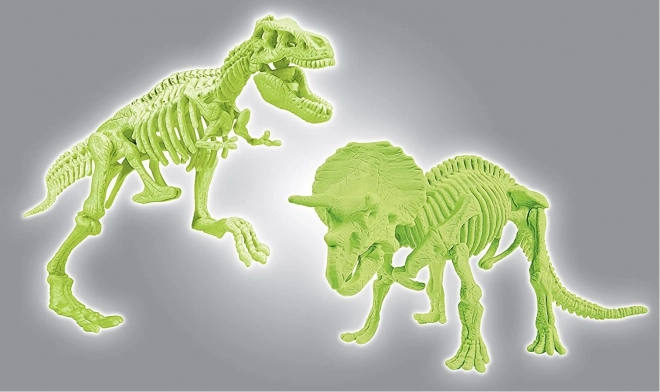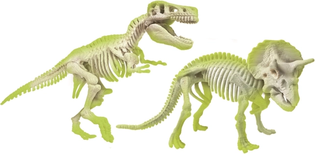Τα φθορίζοντα τμήματα των σκελετών απορροφούν το φυσικό φως και λάμπουν στο σκοτάδι. Τα ολοκληρωμένα μοντέλα T‑Rex και Triceratops αποτελούν εντυπωσιακή διακόσμηση και εκπαιδευτικό βοήθημα.