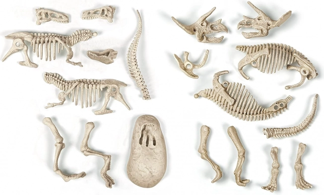 - Πλήρης εξοπλισμός: σφυράκι, καλέμι, μπλοκ για ανασκαφές, μέρη σκελετών T‑Rex και Triceratops, κάρτες, εγχειρίδιο.