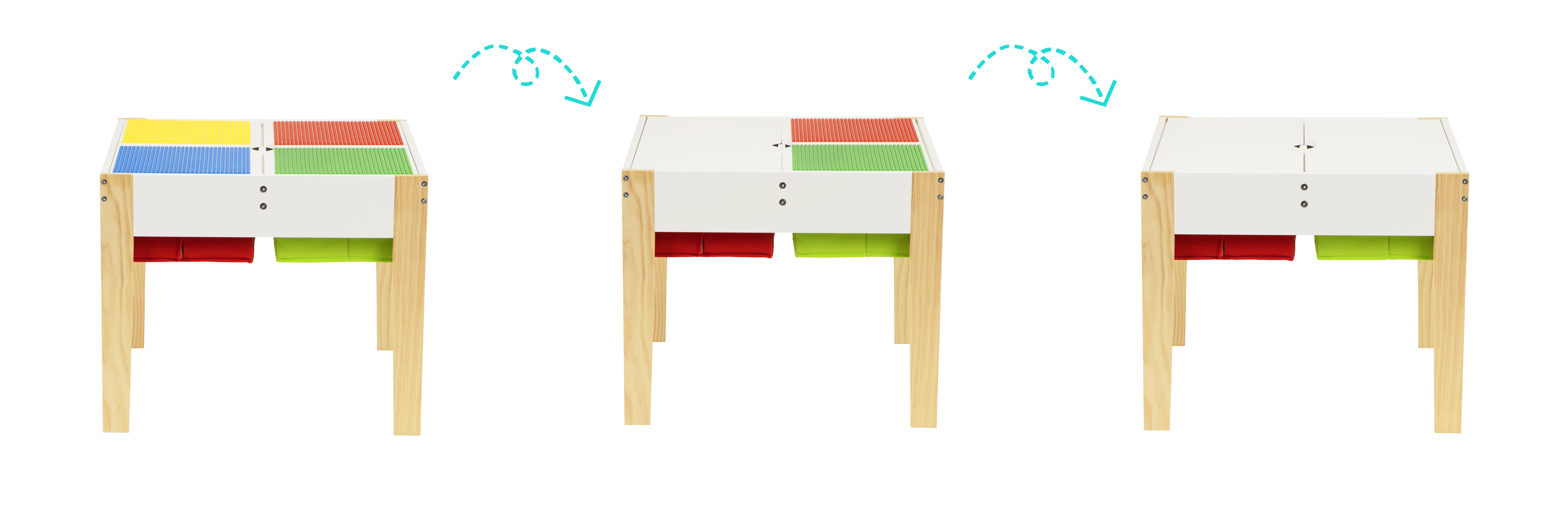 Η δίχρωμη, περιστρεφόμενη και αποσπώμενη επιφάνεια αποτελείται από δύο μέρη: η μία πλευρά είναι συμβατή με τουβλάκια και ενθαρρύνει τη δημιουργική κατασκευή, ενώ η άλλη είναι λεία για ζωγραφική, γραφή και χειροτεχνίες. Στο κέντρο θα βρείτε 4 ευρύχωρα καλάθια, όπου τα παιδιά αποθηκεύουν τουβλάκια, μαρκαδόρους, χαρτιά και βιβλιαράκια – έτσι το μάζεμα γίνεται σε χρόνο μηδέν.
