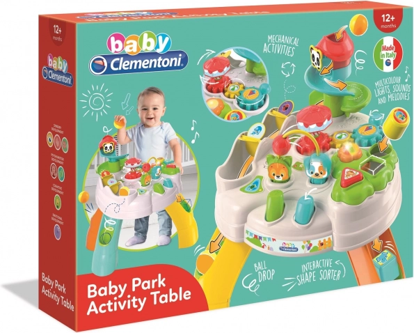 Το τραπεζάκι Activity Park έχει σχεδιαστεί σαν ένα μικρό πάρκο διασκέδασης, όπου τα παιδιά μαθαίνουν μέσα από το παιχνίδι. Με την περιστροφή των γραναζιών κινείται το καρουζέλ, με το πάτημα των κουμπιών τίθενται σε κίνηση οι φιγούρες και η πίστα με μπίλιες με τις τσουλήθρες καταλήγει σε μια διασκεδαστική άφιξη στα πόδια του τραπεζιού. Τα έντονα χρώματα, τα φώτα και οι ήχοι τραβούν την προσοχή και ενισχύουν τη συγκέντρωση.