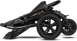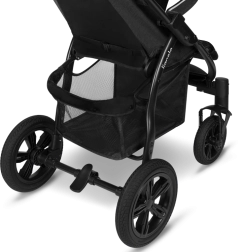 Οι μεγάλοι τροχοί χωρίς συντήρηση με ανθεκτικό πέλμα και πλήρη ανάρτηση διαχειρίζονται ομαλά τα καλντερίμια και τις ανωμαλίες. Για βεβαιότητα στον έλεγχο δεν λείπουν ο κλειδωτικός μηχανισμός των μπροστινών τροχών και το κεντρικό ποδόφρενο. Χάρη στη 9-σταδιακή ρύθμιση της λαβής προσαρμόζετε το καρότσι στο ύψος σας. Την ασφάλεια εξασφαλίζουν οι ζώνες 5 σημείων με μαλακές επωμίδες και τα ανακλαστικά στοιχεία στην κουκούλα, τη μπάρα και το υποπόδιο. Το καρότσι πληροί το πρότυπο EN 1888.
