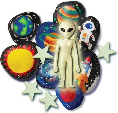 Το σετ 4M για ζωγραφική σε πέτρες είναι ο ιδανικός τρόπος για να εκφράσουν τα παιδιά τη δημιουργικότητά τους. Αυτό το υπέροχο σετ περιλαμβάνει όλα όσα χρειάζεται το παιδί σας για να δημιουργήσει τα δικά του διαστημικά έργα τέχνης, συμπεριλαμβανομένων φωσφοριζουσών αστεριών και ενός εξωγήινου που λάμπει στο σκοτάδι. Επιτρέπει στα παιδιά όχι μόνο να δημιουργούν, αλλά και να επινοούν τις δικές τους μικρές ιστορίες για τη ζωή στο διάστημα.