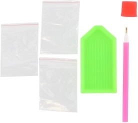 Διαδικασία ζωγραφικής: Η επάνω πλευρά του καμβά είναι επικαλυμμένη με κόλλα και καλύπτεται με διαφανή μεμβράνη, την οποία αφαιρείτε σταδιακά κατά τμήματα. Ο καμβάς περιέχει σύμβολα που αντιστοιχούν στα σακουλάκια με τα πετραδάκια. Βουτήξτε το στυλό στο κερί και, με τη βοήθειά του, τοποθετήστε τα πετραδάκια στον καμβά σύμφωνα με τον οδηγό.