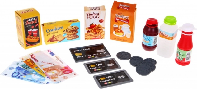 Το σετ περιλαμβάνει επίσης απομιμήσεις τροφίμων όπως κέτσαπ, χυμό, γάλα και διάφορα χάρτινα κουτιά, που εμπλουτίζουν το παιχνίδι και τη φαντασία των παιδιών.