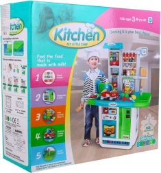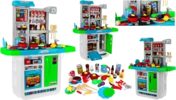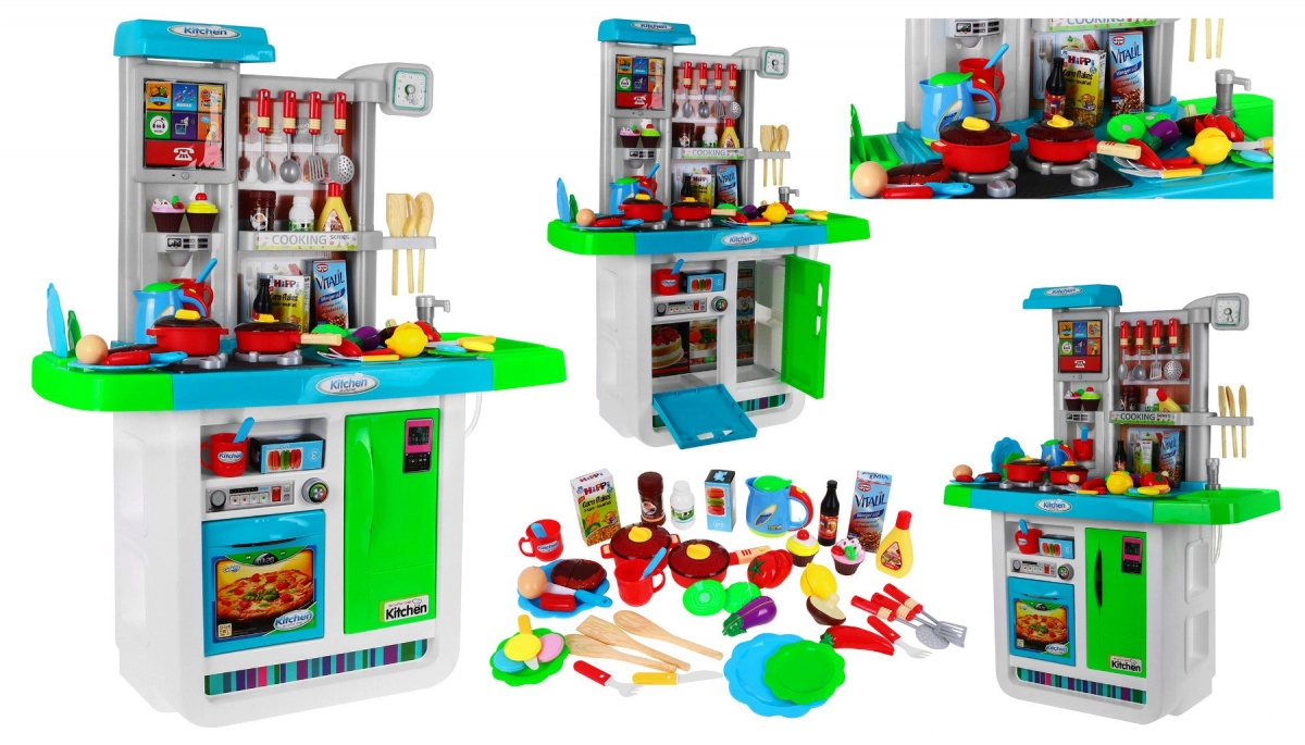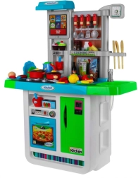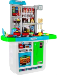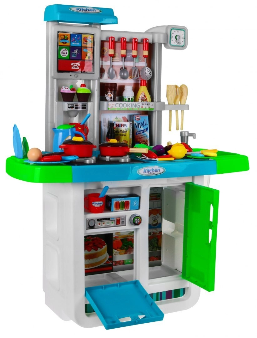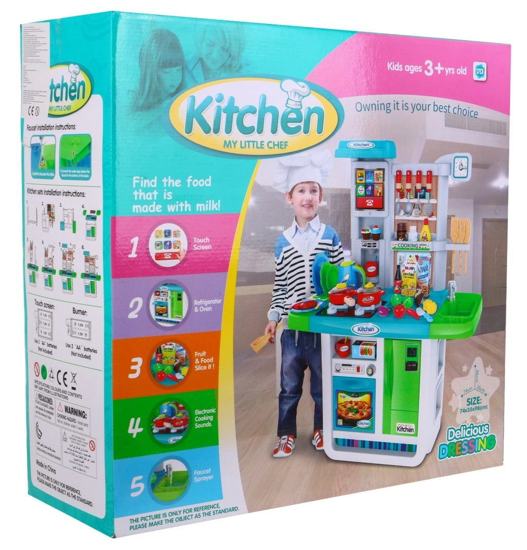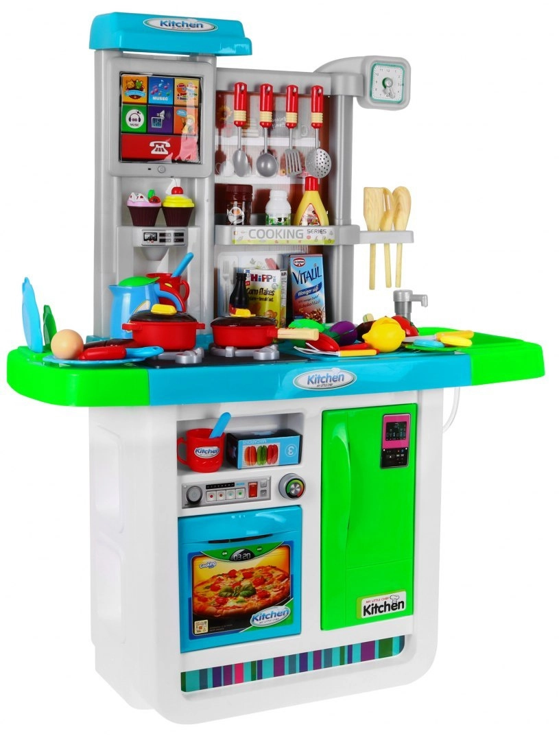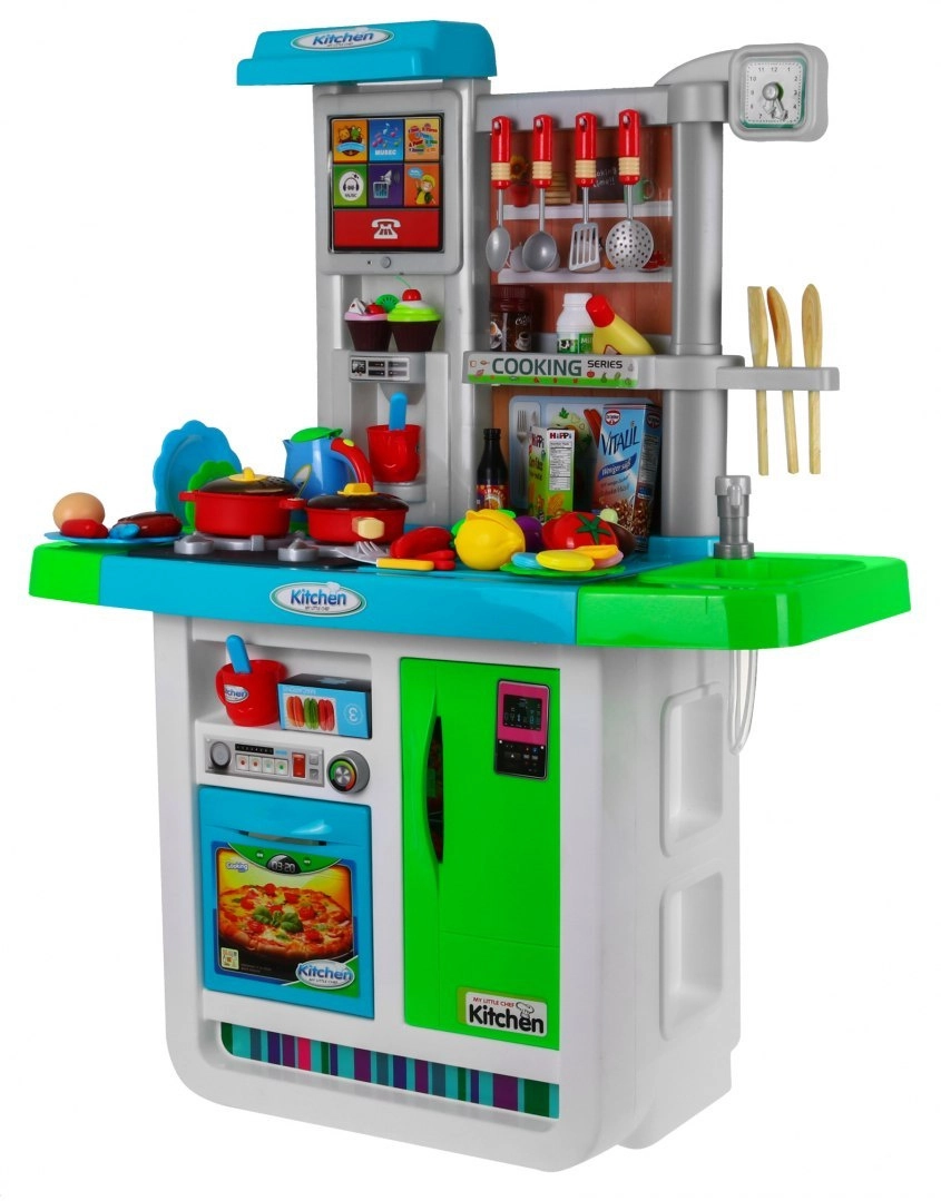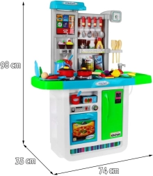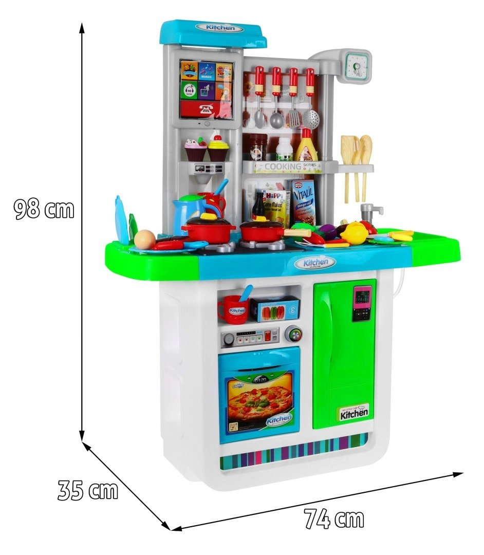 Αυτή η ευρύχωρη παιδική κουζινούλα σε ζωηρά χρώματα προσφέρει ρεαλιστικά αξεσουάρ και λειτουργίες, ώστε τα παιδιά να απολαμβάνουν το μαγείρεμα όπως σε αληθινή κουζίνα. Δύο εστίες με φώτα και ήχους τηγανίσματος και βρασμού, νεροχύτης με βρύση αληθινού νερού και οθόνη αφής με μελωδίες και ήχους εξασφαλίζουν απορροφητικό παιχνίδι.