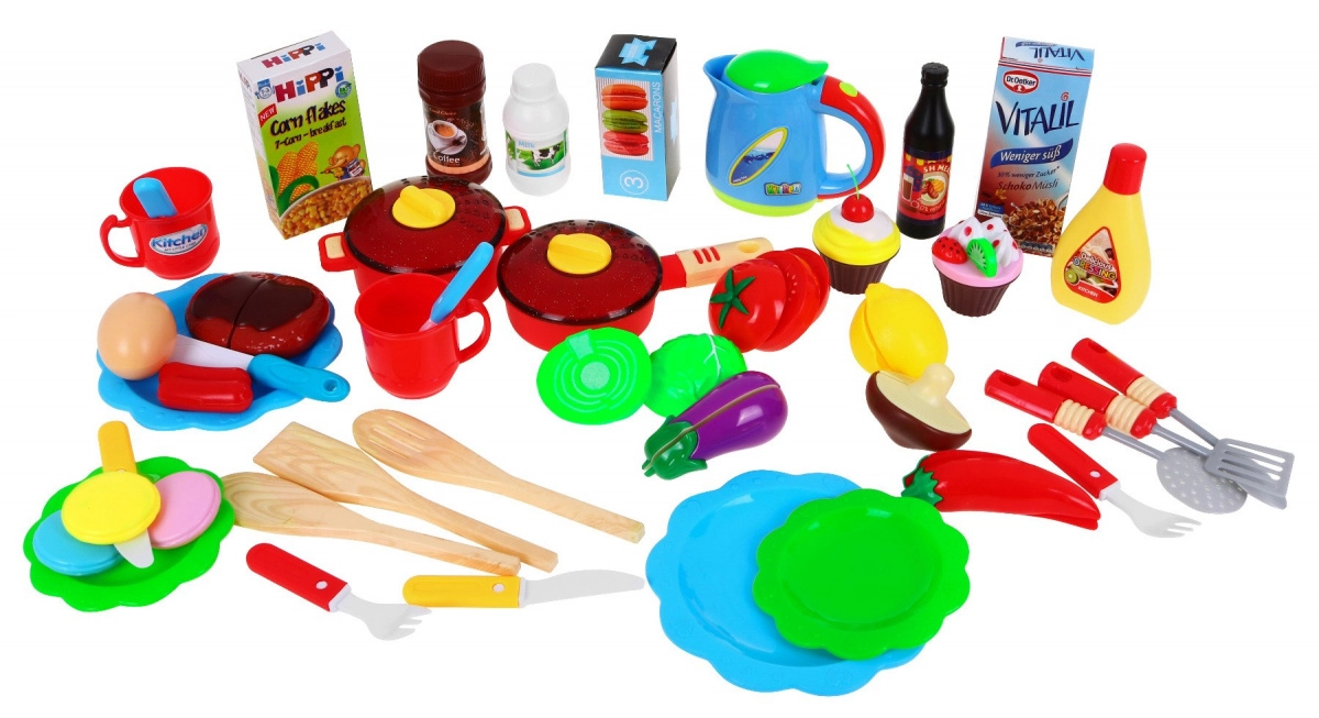 Περιλαμβάνονται στεγνωτήρας πιάτων, ενσωματωμένη επιφάνεια κοπής, ρολόι, πλαϊνά ράφια και πολλά κουζινικά σκεύη, τρόφιμα και σκεύη σερβιρίσματος. Η κουζινούλα συναρμολογείται εύκολα, διαθέτει πιστοποίηση CE και είναι ιδανική ως δώρο.