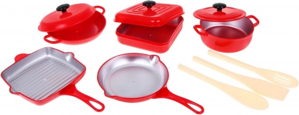 Όλα όσα χρειάζονται τα παιδιά: 2 κατσαρόλες με καπάκια, γουόκ με καπάκι, 2 τηγάνια, 3 κουτάλες και σετ μαγείρου. Συσκευασμένο σε φορητό κουτί – εξαιρετικό και ως δώρο.