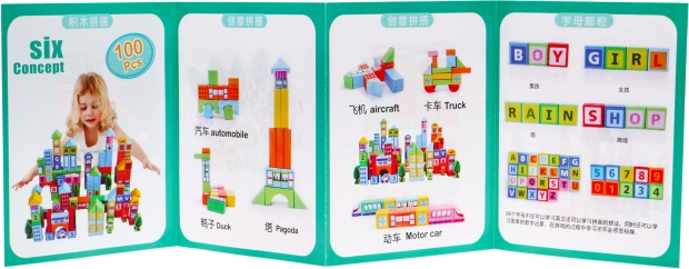 - 100 ξύλινα τουβλάκια διαφόρων σχημάτων και χρωμάτων, εικονογραφημένο ενημερωτικό φυλλάδιο με έμπνευση