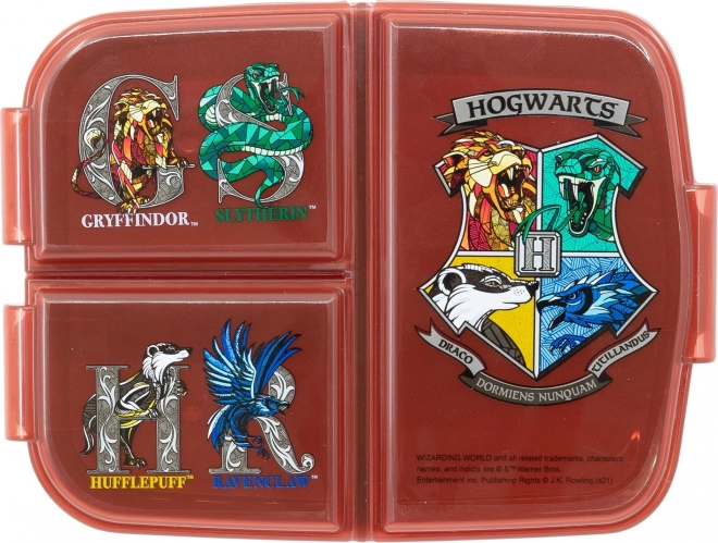 Πρακτικό παιδικό δοχείο σνακ με τρία χωρίσματα με θέμα HARRY POTTER διατηρεί το φαγητό χωριστό και φρέσκο. Είναι κατασκευασμένο από ανθεκτικό πλαστικό, χωράει άψογα στη σχολική τσάντα και χάρη στο ασφαλές κλείσιμο είναι ιδανικό για ταξίδια, για το σχολείο και για την παιδική χαρά.