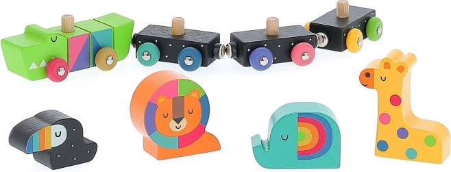 Ξεκινήστε μια δημιουργική διαδρομή με τα παιδιά σας με το πολύχρωμο τρενάκι με ζωάκια από τον αναγνωρισμένο εικονογράφο Andy Westface. Αυτό το μοναδικό ξύλινο σετ περιλαμβάνει τουβλάκια σε διαφορετικά μεγέθη και σχήματα, με ζωηρά χρώματα. Η ατμομηχανή και τα βαγονάκια, που απεικονίζουν ζώα όπως κροκόδειλο, λιοντάρι, ελέφαντα και καμηλοπάρδαλη, συνδέονται έξυπνα με μαγνήτες. Τα παιδιά θα απολαύσουν όχι μόνο τη συναρμολόγηση, αλλά και την αναγνώριση των ζώων.