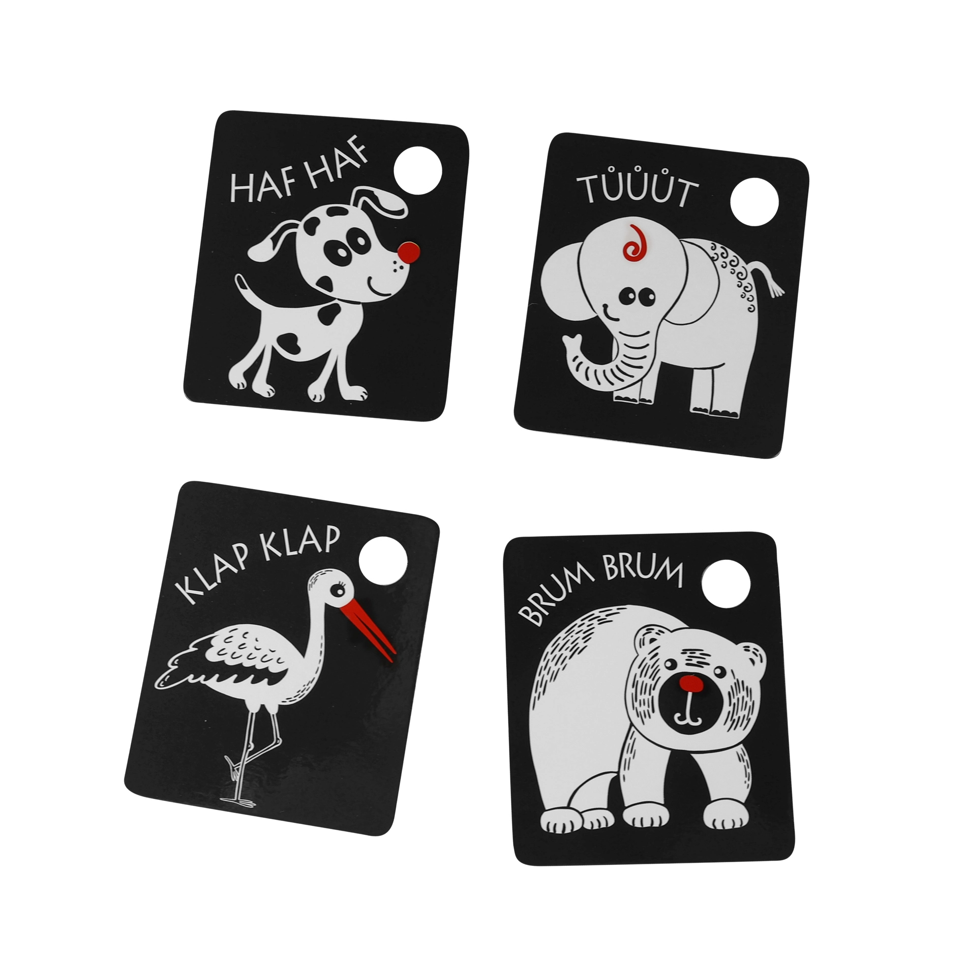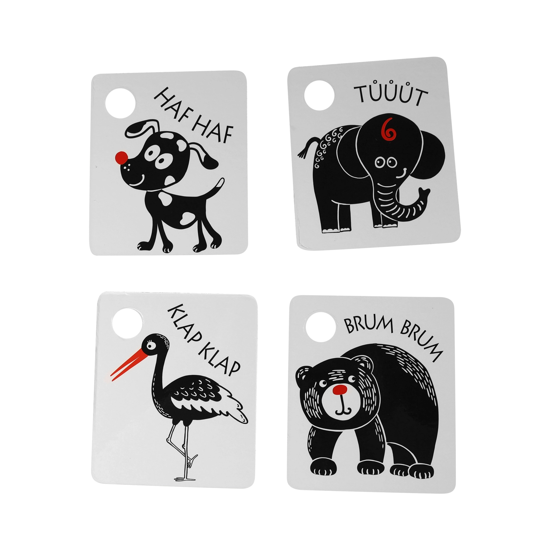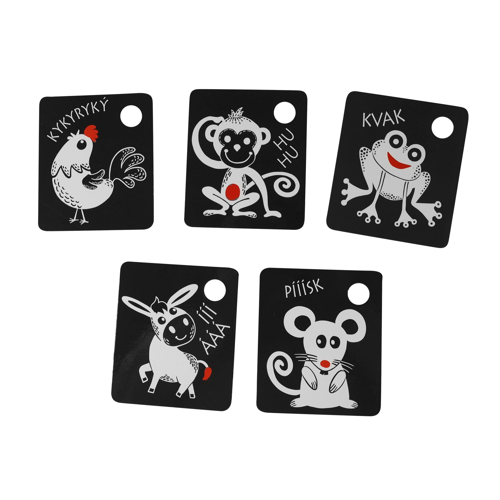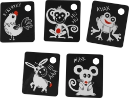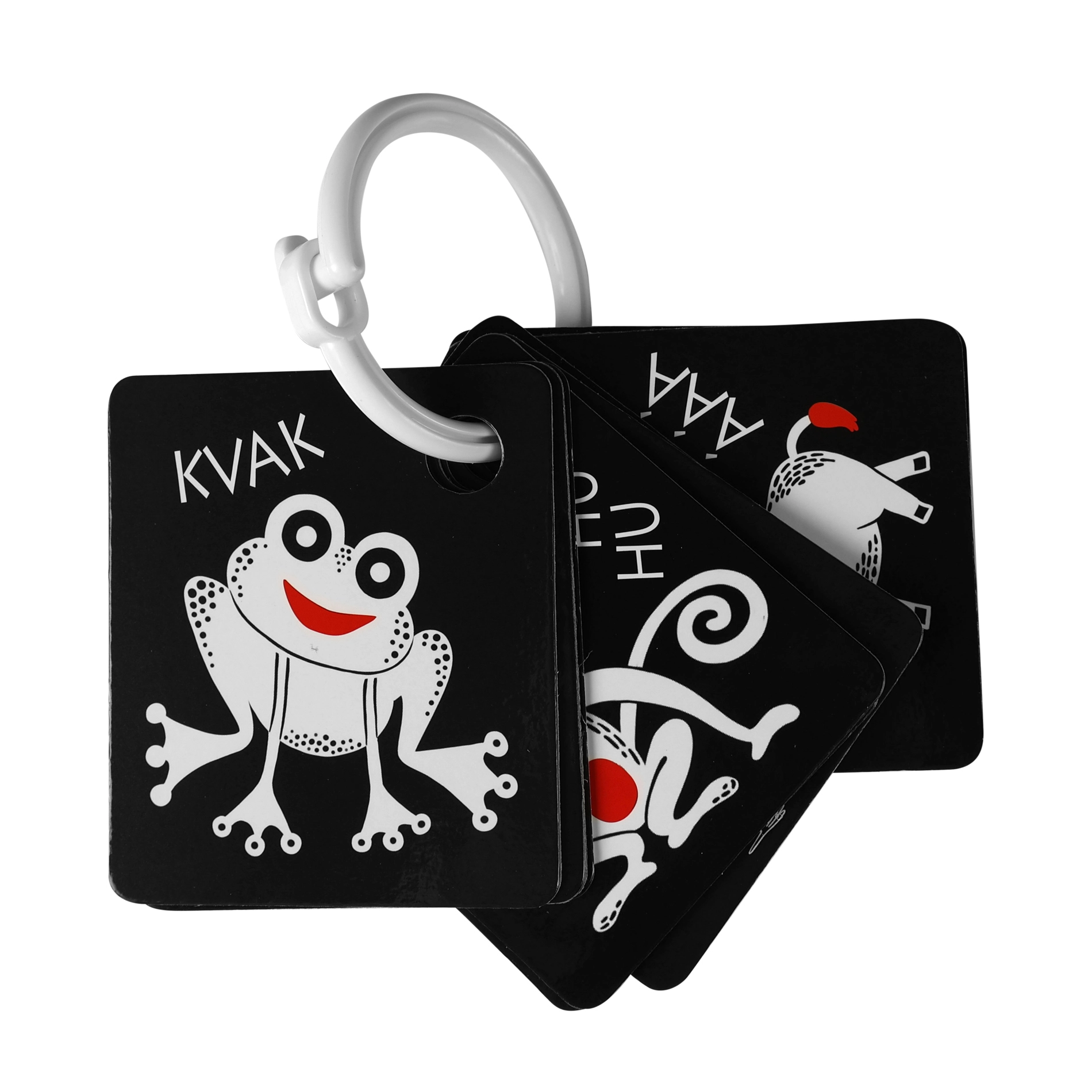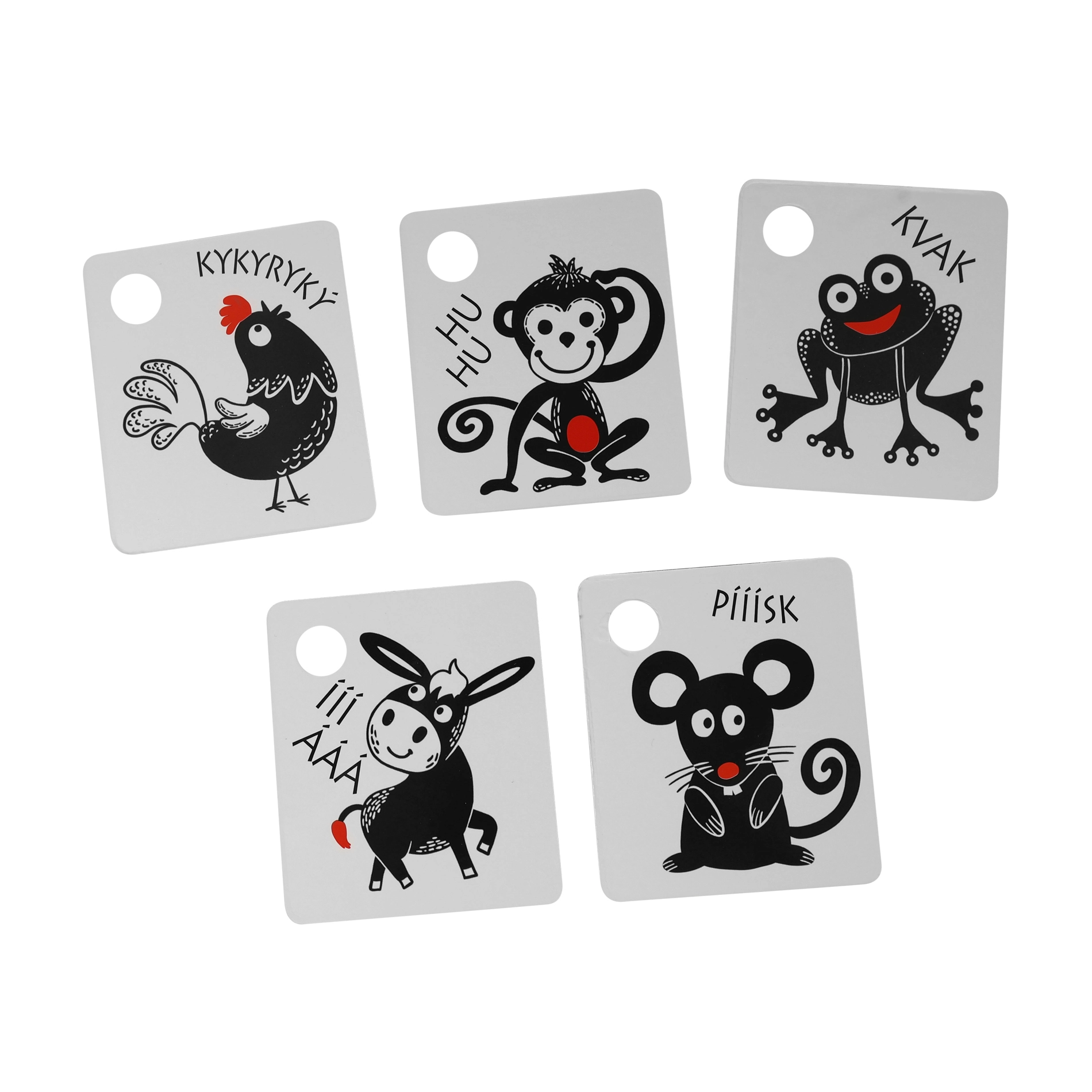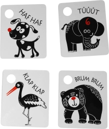 Κάθε κάρτα διαθέτει πρακτικό άνοιγμα για κρέμασμα στην κούνια, το καροτσάκι ή την αψίδα δραστηριοτήτων, ενώ στη συσκευασία περιλαμβάνεται ανθεκτικός πλαστικός κρίκος για εύκολη σύνδεση ολόκληρου του σετ. Τα ποιοτικά τσέχικα υλικά εξασφαλίζουν μεγάλη αντοχή και ασφαλή χρήση.