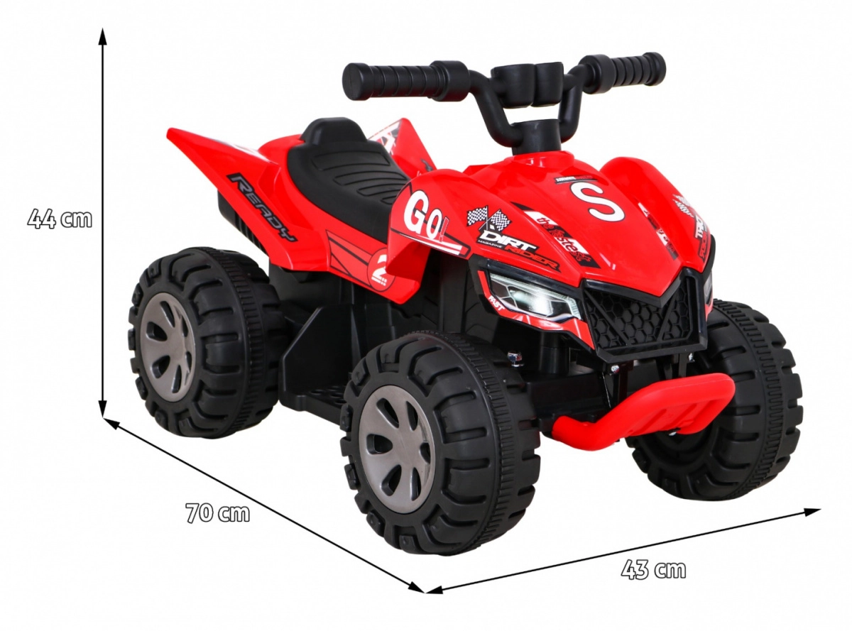 Αυτό το κόκκινο παιδικό τετράτροχο THE FASTEST είναι εξαιρετική επιλογή για μικρούς οδηγούς. Προσφέρει απλό χειρισμό μέσω κουμπιού γκαζιού στη χειρολαβή, οδήγηση μπροστά και πίσω και άνετη σέλα διαστάσεων 26 × 13 cm. Το χαμηλό βάρος 5,5 kg και η διέλευση χάρη στην απόσταση από το έδαφος 7 cm το καθιστούν ιδανικό για επίπεδες επιφάνειες στο σπίτι και στον κήπο.