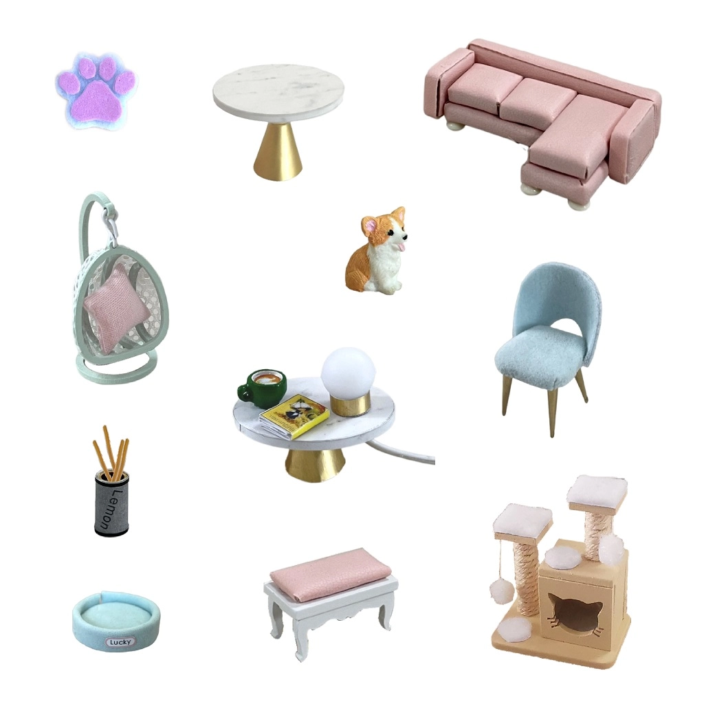 Άνετος καναπές, κρεμαστή πολυθρόνα, κομψό τραπέζι και χαριτωμένη γατούλα με ξύστρα – κάθε κομμάτι έχει σχεδιαστεί με ακρίβεια για ρεαλιστική εμφάνιση εσωτερικού χώρου.