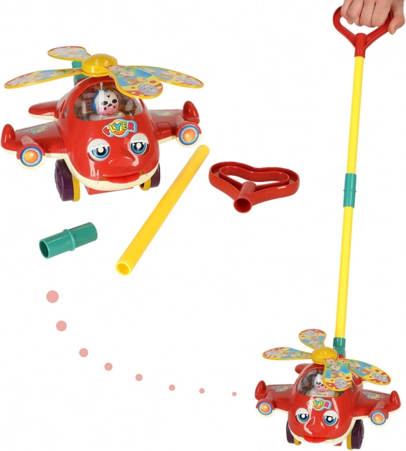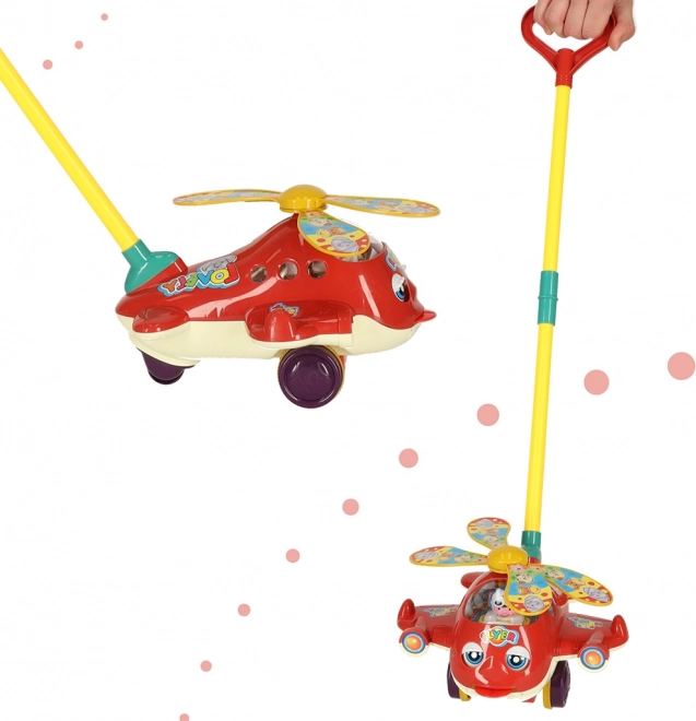 Ο σχεδιασμός του παιχνιδιού περιλαμβάνει ζωηρά χρώματα και χαρούμενα μοτίβα, προσελκύοντας την προσοχή των παιδιών. Το κόκκινο ελικόπτερο κατά την κίνηση περιστρέφει τους έλικες και παράγει ήχο κουδουνιού. Η ράβδος στήριξης είναι σχεδιασμένη ώστε να ταιριάζει στο ύψος του παιδιού και διπλώνει εύκολα για πρακτική αποθήκευση ή μεταφορά.