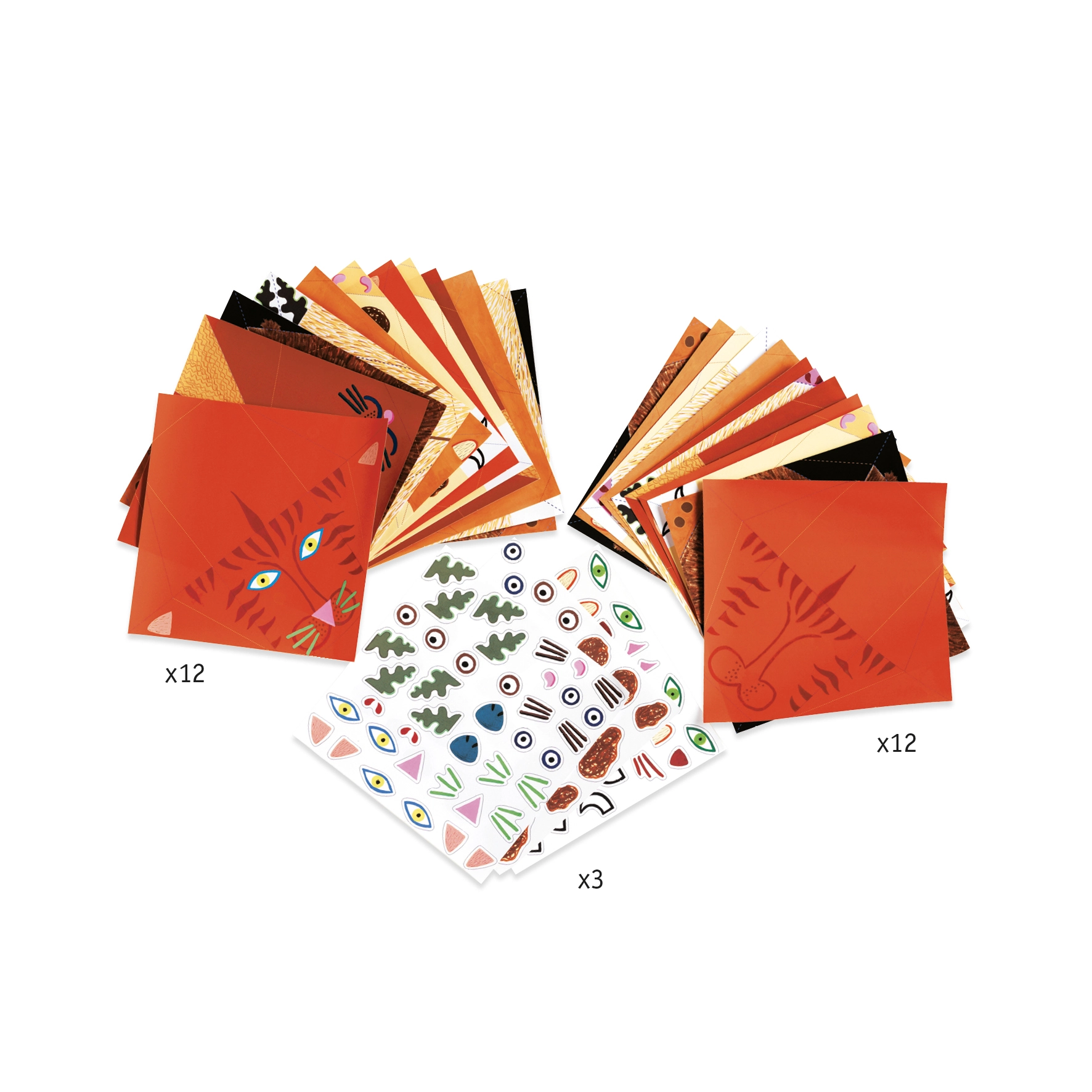 Στη συσκευασία περιλαμβάνονται 24 πολύχρωμα χαρτιά για τη δημιουργία 4 σετ των έξι ζωακίων, 3 φύλλα αυτοκόλλητων και αναλυτικές εικονικές οδηγίες. Χάρη στα σαφή βήματα, το δίπλωμα είναι εύκολο ακόμη και για μικρότερα παιδιά.