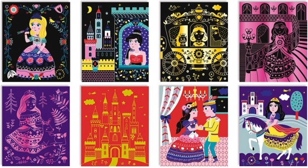 Το σετ περιλαμβάνει οκτώ προεκτυπωμένες κάρτες με πριγκίπισσες, κάστρα και μαγικά σκηνικά. Κάθε μοτίβο εμπνέει τα παιδιά να δημιουργούν και να αφηγούνται τις δικές τους ιστορίες.