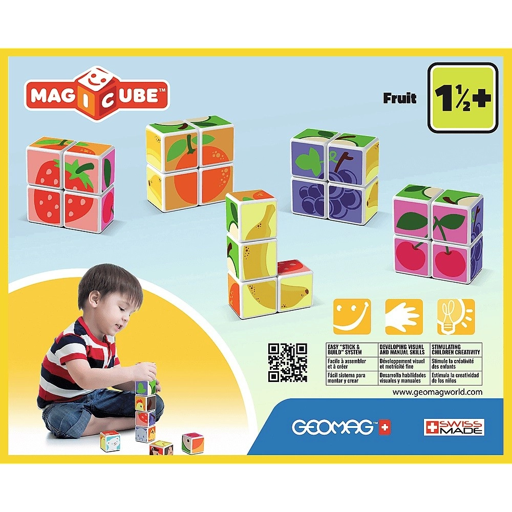 Το σετ Geomag Magicube Φρούτα φέρνει πολύχρωμους μαγνητικούς κύβους με εικονογραφήσεις μήλου, φράουλας, σταφυλιών, κερασιών, μπανάνας και άλλων καρπών. Τα παιδιά μπορούν να συνθέτουν εικόνες φρούτων αλλά και απλές 3D κατασκευές όπως καμινάδα ή μαντράκι. Οι μαγνήτες στο εσωτερικό των κύβων εξασφαλίζουν εύκολη σύνδεση και σταθερότητα των μοντέλων, ώστε το παιχνίδι να είναι διαισθητικό, διασκεδαστικό και χωρίς απογοητεύσεις.