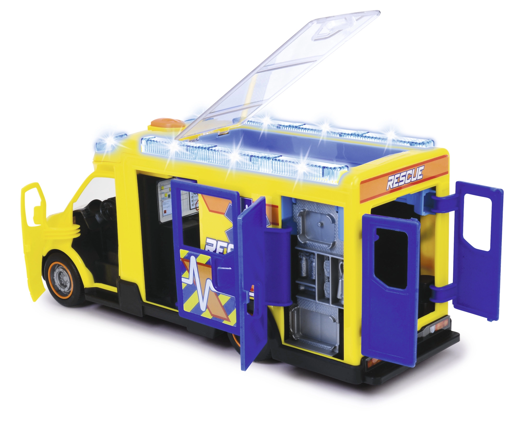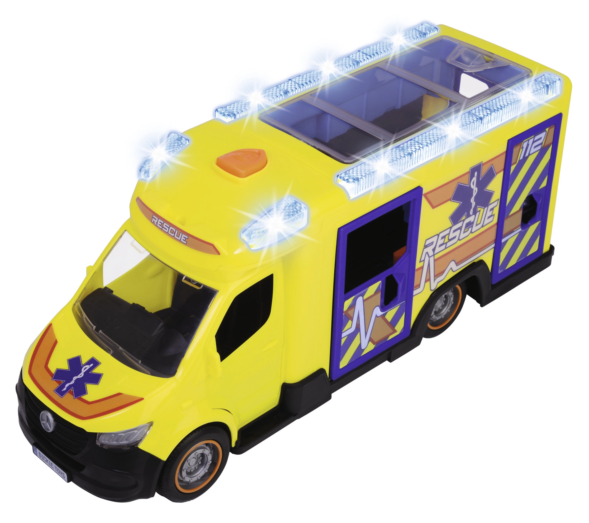 Αυτό το Mercedes-Benz Sprinter από τη Dickie Toys προσφέρει πραγματική εμπειρία διάσωσης με λειτουργίες φωτισμού και ήχου. Το όχημα διαθέτει ανοιγόμενες πόρτες οδηγού, συνοδηγού, πλαϊνές και πίσω πόρτες, καθώς και διαφανή οροφή για πρόσβαση στο λεπτομερές εσωτερικό.