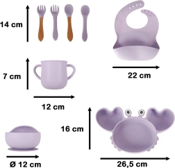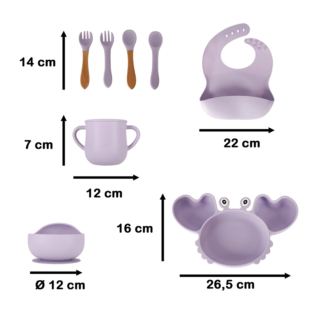 Πλήρες σετ σιλικόνης 9 τεμαχίων για τα πρώτα ανεξάρτητα γεύματα. Περιλαμβάνει πιάτο σε σχήμα καβουριού, μπολ με βεντούζα, εκπαιδευτικό ποτηράκι με δύο καπάκια και καλαμάκι, μαχαιροπίρουνα και πρακτικό σαλιάρα. Όλα από ασφαλή σιλικόνη χωρίς BPA, με αντιολισθητικές βεντούζες και εύκολη συντήρηση για καθαρό και άνετο φαγητό των μικρών παιδιών.
