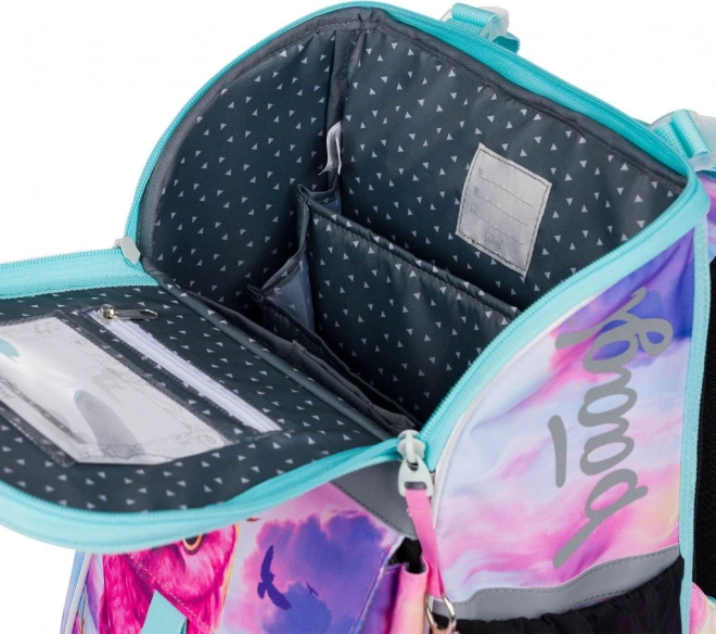 Η τσάντα διαθέτει νέο ανακλινόμενο σύστημα ανοίγματος, που διευκολύνει την πρόσβαση στα σχολικά είδη κατευθείαν από το θρανίο. Στο εσωτερικό θα βρείτε διάφανη τσέπη με ωρολόγιο πρόγραμμα, εσωτερικό οργανωτή με λάστιχο και πλαϊνές τσέπες από ανθεκτικό δίχτυ, κατάλληλες για μπουκάλι νερού.