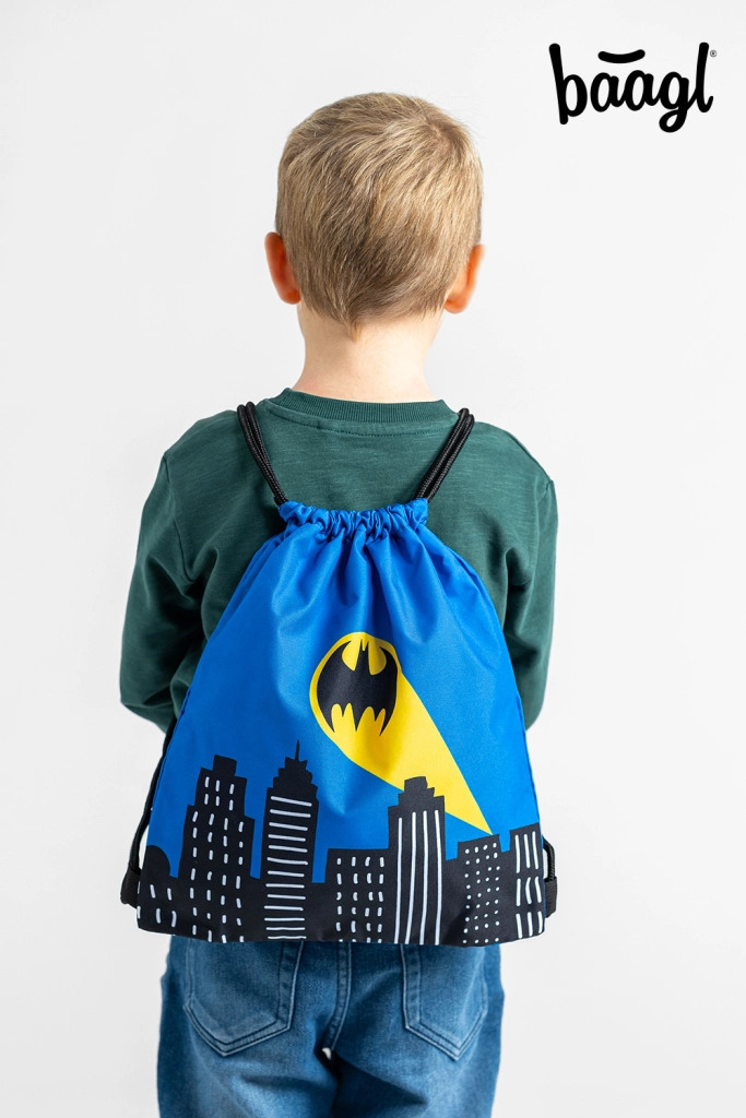 Το μπλε σακουλάκι διακοσμείται με το εμβληματικό λογότυπο του Batman και μοναδικό αστικό μοτίβο.