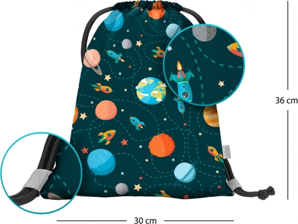Ελαφρύς και πρακτικός προσχολικός σάκος Baagl με μοτίβο Πλανήτες, ιδανικός για παπούτσια και μικροαντικείμενα για δραστηριότητες και ελεύθερο χρόνο. Κατασκευασμένος από ανθεκτικό, πλενόμενο υλικό, με κλείσιμο μέσω στιβαρών κορδονιών, που επιτρέπουν επίσης άνετη μεταφορά στην πλάτη.