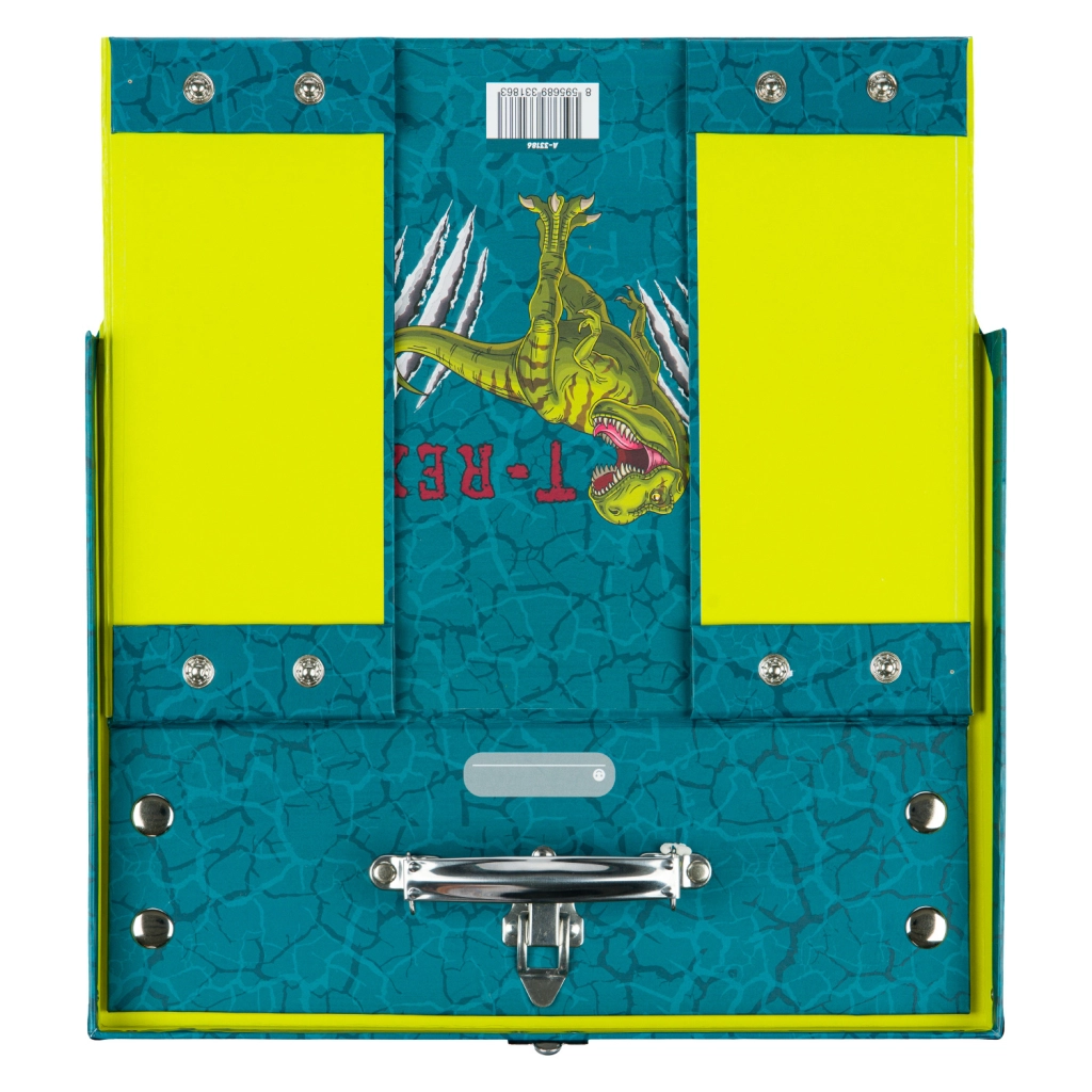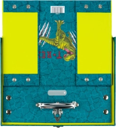 Στυλάτη σχολική βαλίτσα με μοτίβο T‑REX από ανθεκτικό επικαλυμμένο χαρτί, προσφέρει πτυσσόμενη κατασκευή με κουμπώματα, ανθεκτικά μεταλλικά εξαρτήματα με μεταλλωμένες γωνίες και μεταλλική λαβή για άνετη μεταφορά. Η ασφαλής κλείστρα με πόρπη προστατεύει το περιεχόμενο και ο έντονος τιρκουάζ‑κίτρινος σχεδιασμός ενθουσιάζει κάθε μαθητή.