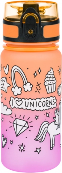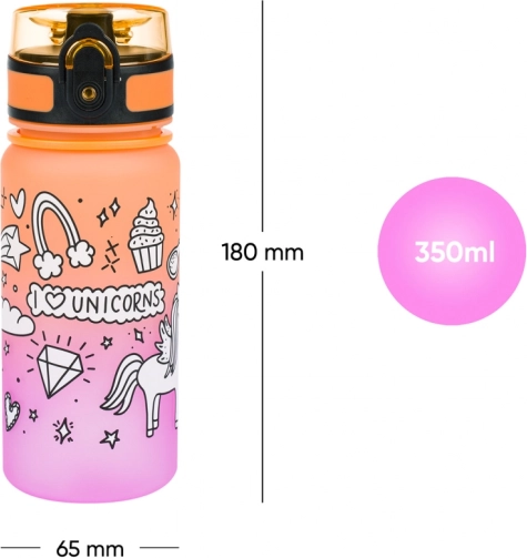 Στιλάτο παγούρι από tritan χωρητικότητας 350 ml με μοτίβο μονόκερου και χρωματική διαβάθμιση, ιδανικό για το σχολείο, εκδρομές και σπορ. Προσφέρει ασφαλές κλειδωμένο καπάκι, πρακτικό λουράκι μεταφοράς και εσωτερικό φίλτρο για φρούτα ή βότανα. Είναι κατασκευασμένο από πιστοποιημένο tritan χωρίς BPA, χωρίς οσμές και κατάλληλο και για ζεστά ροφήματα.