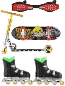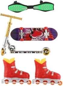 Αυτό το σετ δαχτύλων φέρνει τέσσερα αγαπημένα αστικά σπορ σε μίνι μορφή: skateboard, waveboard, in-line πατίνια και πατίνι. Τα παιδιά μπορούν να δοκιμάζουν νέα κόλπα, να δημιουργούν δικές τους διαδρομές και να αναπτύσσουν τη δημιουργικότητα και την επιδεξιότητά τους. Χάρη στις συμπαγείς διαστάσεις, το σετ χωρά εύκολα στο σακίδιο και είναι ιδανικό για διασκέδαση οπουδήποτε.