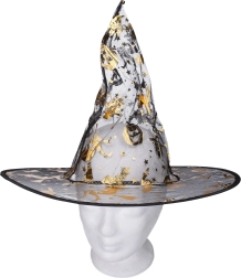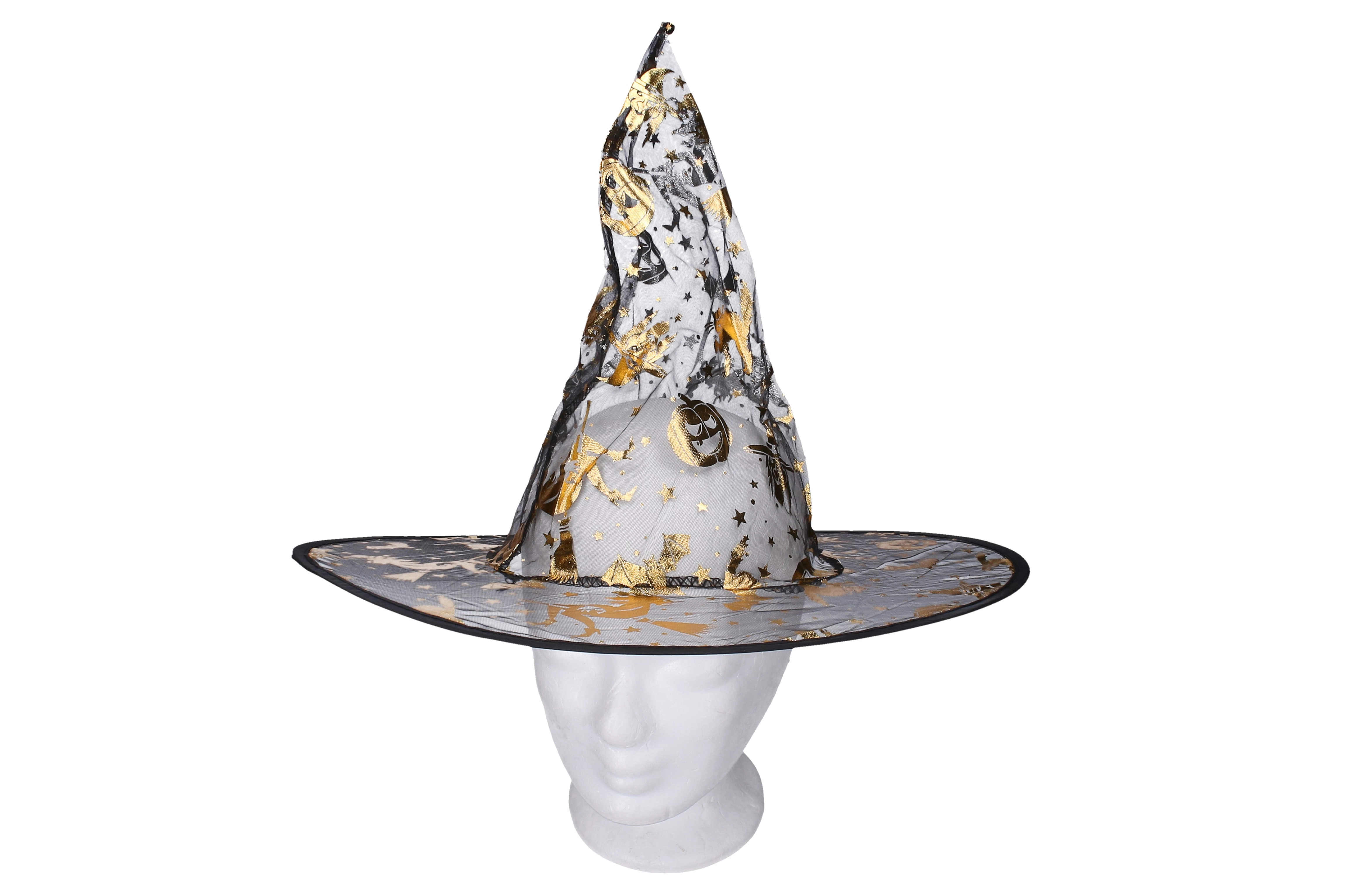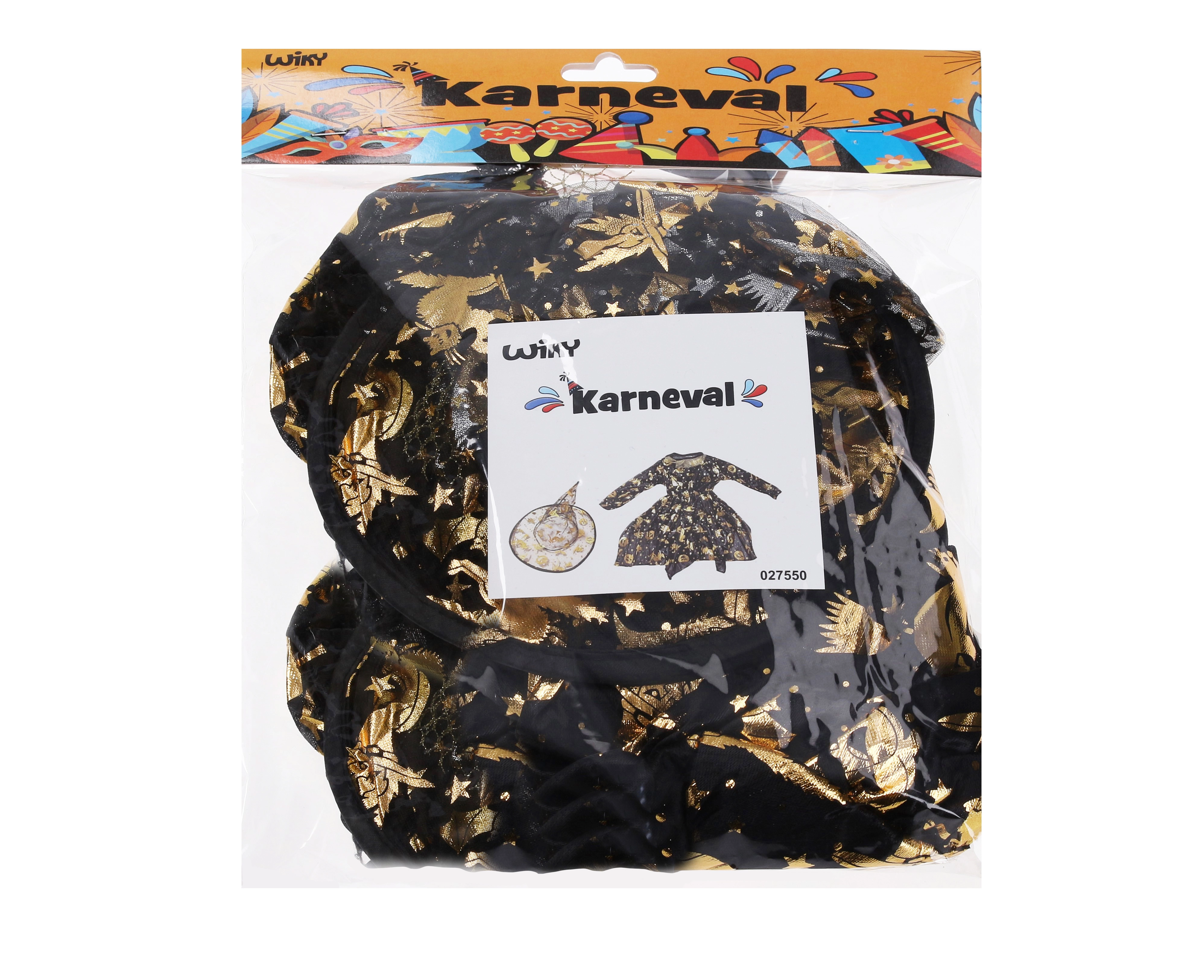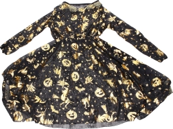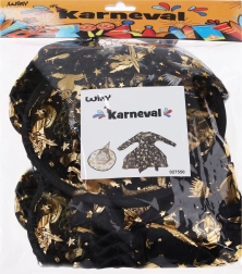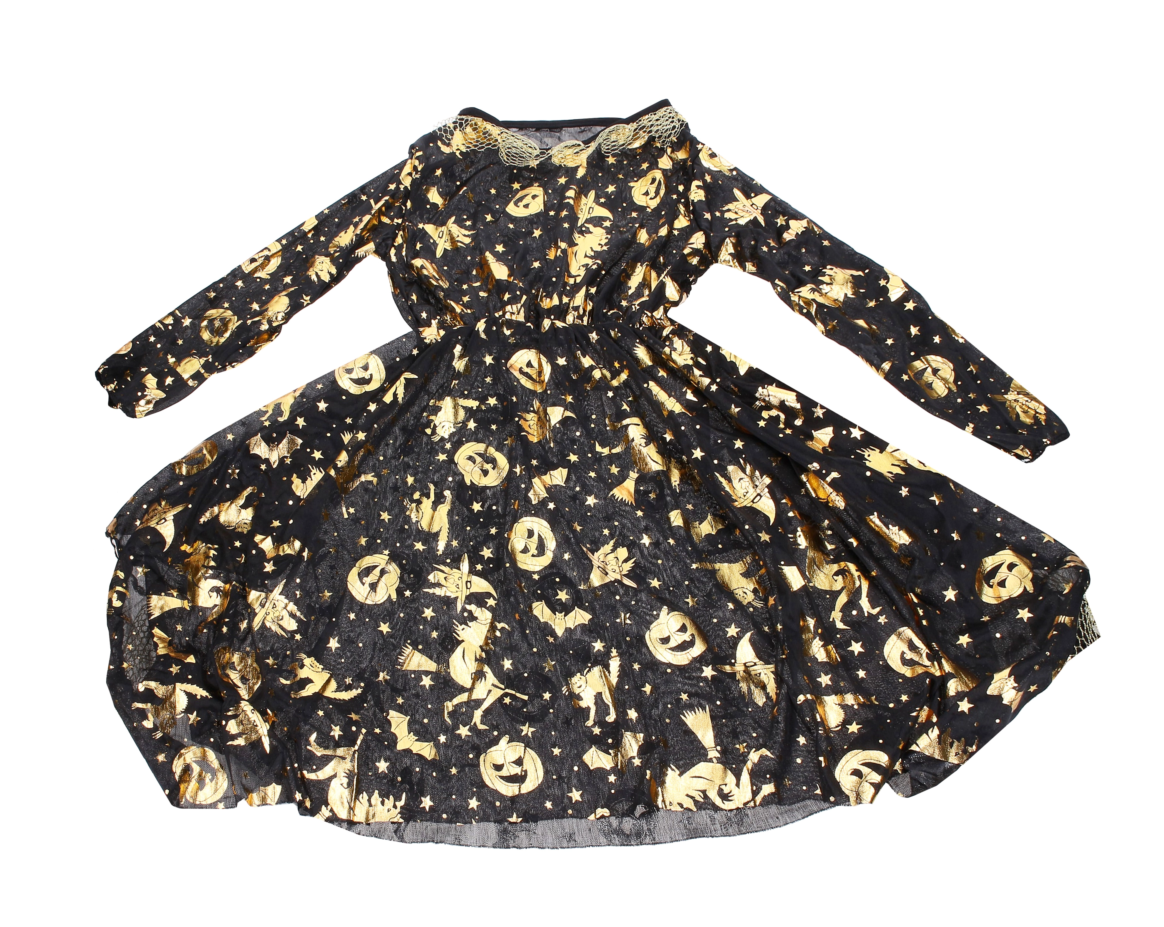 Κομψή αποκριάτικη στολή μάγισσας σε χρυσό χρώμα, περιλαμβάνει φόρεμα και καπέλο και είναι ιδανική για απόκριες, μασκέ και Halloween. Διατίθεται σε μεγέθη S, M, L.