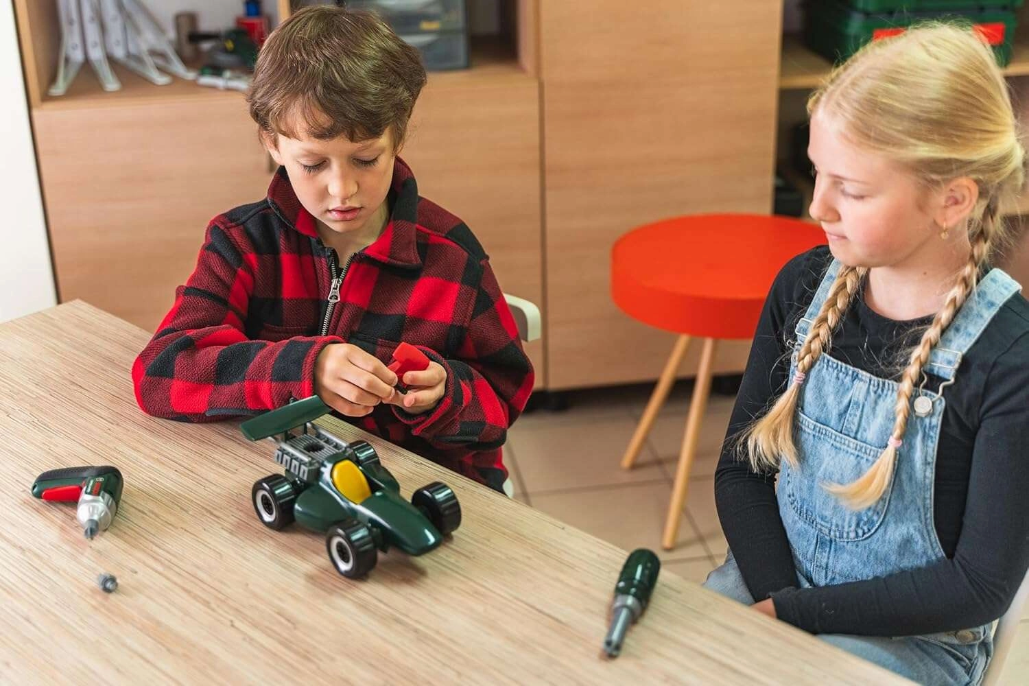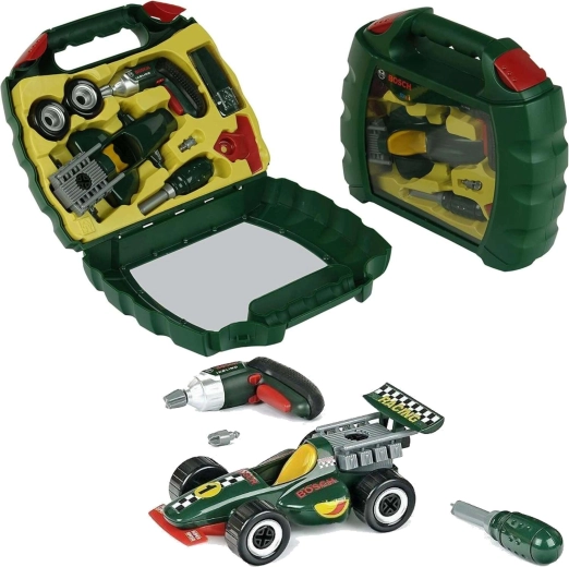 Παιδικό σετ κατασκευής αγωνιστικού αυτοκινήτου σε πρακτικό βαλιτσάκι με αδειοδοτημένο ασύρματο κατσαβίδι BOSCH Ixolino από την KLEIN, που προσφέρει ώρες δημιουργικής διασκέδασης. Τα παιδιά συναρμολογούν μόνα τους το αυτοκίνητο με ασφαλή εργαλεία και στη συνέχεια παίζουν οδηγώντας το. Περιλαμβάνει εναλλάξιμα μέρη, μεγάλους τροχούς και αυτοκόλλητα για την τελική εμφάνιση. Αναπτύσσει τη λεπτή κινητικότητα, ενισχύει τη φαντασία και χάρη στην ανθεκτική κατασκευή αντέχει στο καθημερινό παιχνίδι.