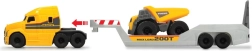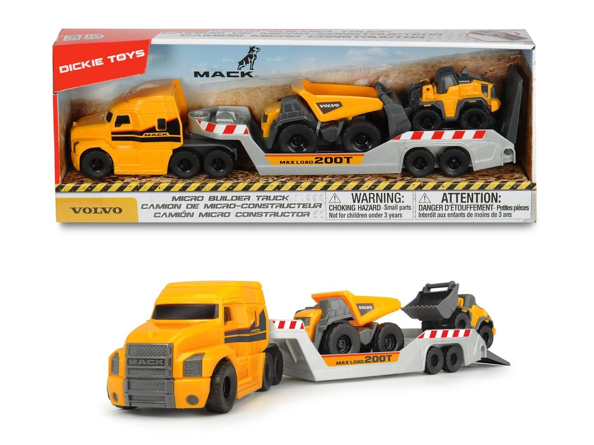 Με αυτό το ποιοτικό σετ Micro Builder τα παιδιά στήνουν εύκολα το δικό τους εργοτάξιο. Το MACK Truck προσφέρει ευρύχωρη επιφάνεια φόρτωσης για τη μεταφορά του ανατρεπόμενου και του τροχοφόρου φορτωτή VOLVO, ενώ η κινητή ράμπα διευκολύνει τη φόρτωση και εκφόρτωση. Χάρη στον διαισθητικό σχεδιασμό, το ρυμουλκούμενο μπορεί να συνδεθεί και να αποσυνδεθεί εύκολα ακόμη και από παιδικά χέρια.