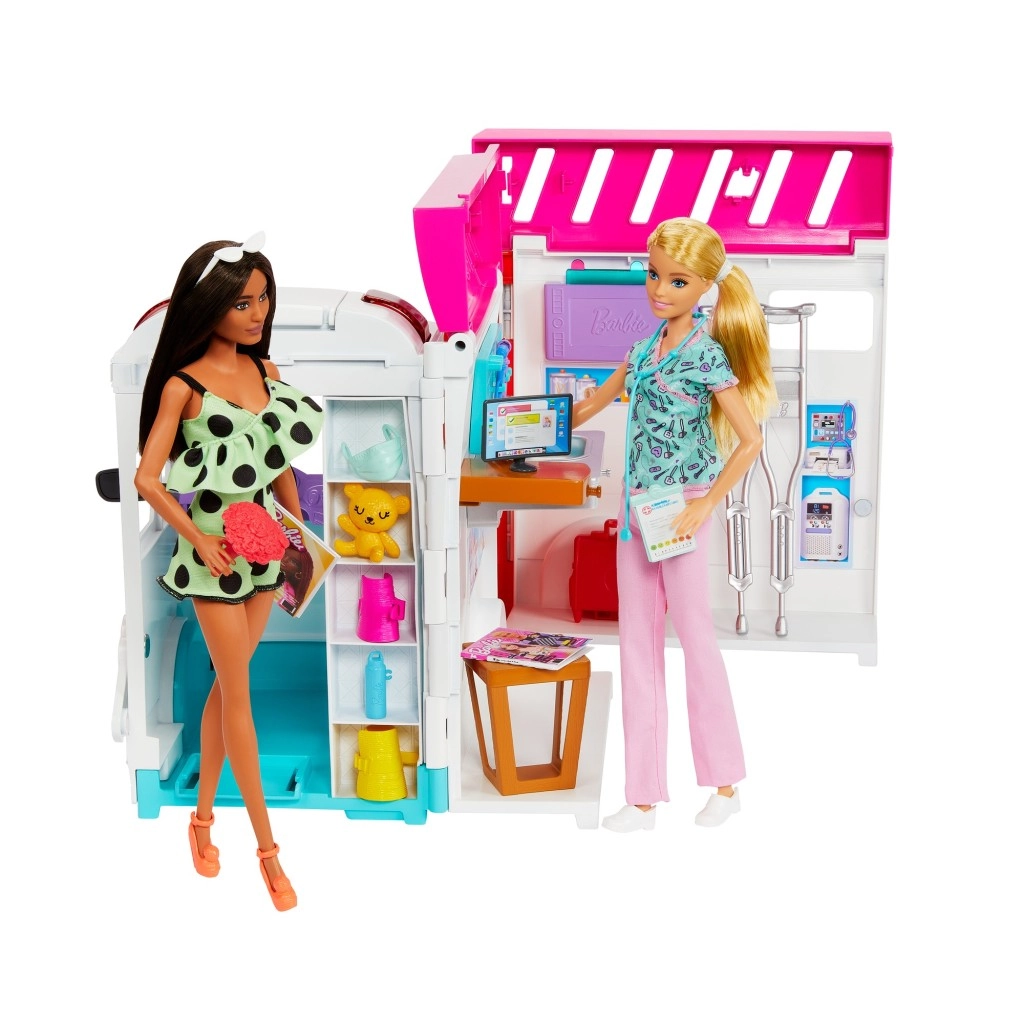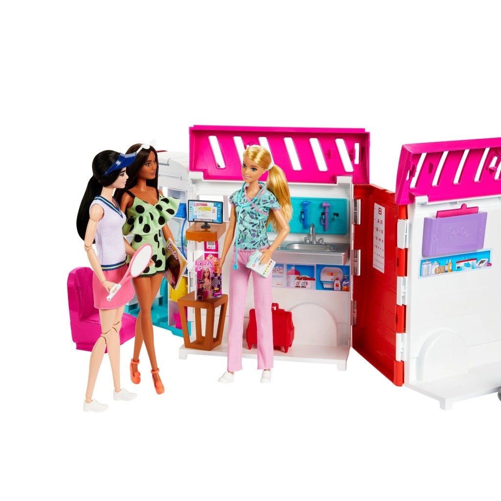 Ανακαλύψτε τη χαρά του παιχνιδιού με την κινητή κλινική της Barbie, ιδανική για μικρούς γιατρούς και γιατρίνες! Αυτό το μεταμορφώσιμο ασθενοφόρο εντυπωσιάζει με το άρτια εξοπλισμένο εσωτερικό του, που περιλαμβάνει εξεταστικό τραπέζι, υποδοχή και αίθουσα αναμονής. Τα παιδιά μπορούν εύκολα να εναλλάσσουν μεταξύ ασθενοφόρου και ιατρικού κέντρου, ώστε το παιχνίδι γεμάτο φαντασία να μην κουράζει ποτέ.
