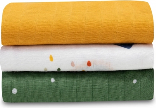 Τρεις πάνες διαστάσεων 70 × 70 cm με διαφορετικά μοτίβα για καθημερινή χρήση – για το καρότσι, τον θηλασμό, την αλλαγή πάνας και ως ελαφριά κουβερτούλα.