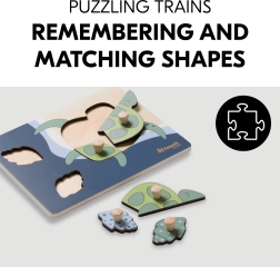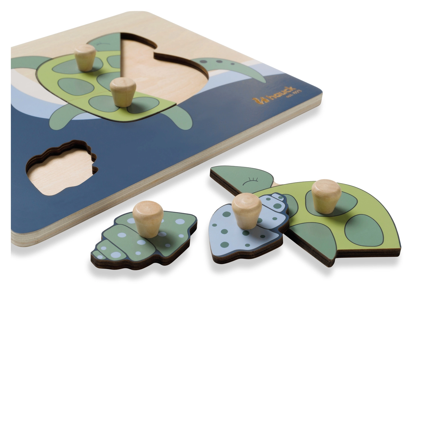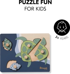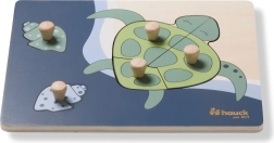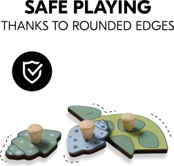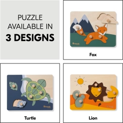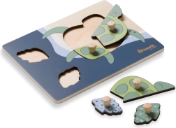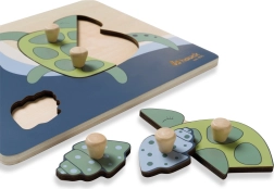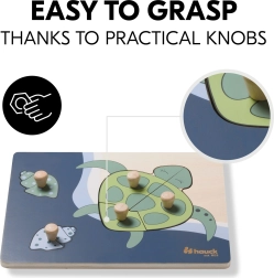 Το ξύλινο παζλ με λαβές Turtle έχει σχεδιαστεί για τα μικρά παιδικά χέρια. Κάθε κομμάτι διαθέτει ξύλινο κουμπί για εύκολο κράτημα και ακριβή τοποθέτηση. Με τη συναρμολόγηση, το παιδί εξασκεί τη λεπτή κινητικότητα, τον συντονισμό ματιού και χεριού, τη μνήμη και την αντίληψη σχημάτων και χρωμάτων. Οι στρογγυλεμένες άκρες εξασφαλίζουν ασφαλές παιχνίδι ήδη από 12 μηνών.