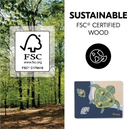 Το παιχνίδι είναι κατασκευασμένο από ξύλο με πιστοποίηση FSC, επομένως είναι φιλικό προς το περιβάλλον και ανθεκτικό για καθημερινό παιχνίδι. Η απαλή παλέτα πράσινων και μπλε τόνων διεγείρει την περιέργεια ενώ προσφέρει αίσθηση ηρεμίας.