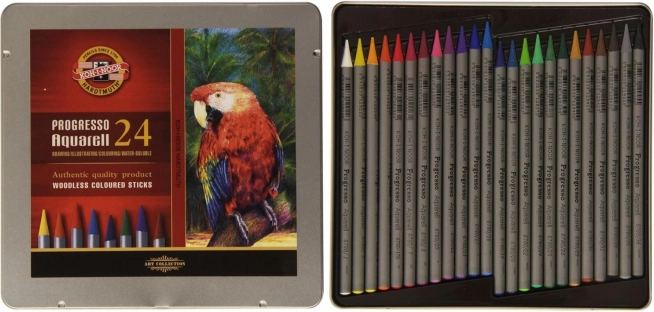 Το σετ καλλιτεχνικών παστέλ Progresso Aquarell από τη μάρκα KOH-I-NOOR προσφέρει 24 παστέλ σε κομψή μεταλλική θήκη, ιδανικό για αρχάριους και έμπειρους καλλιτέχνες.