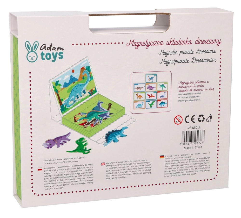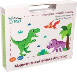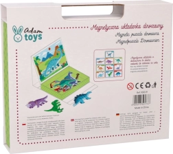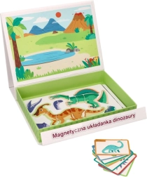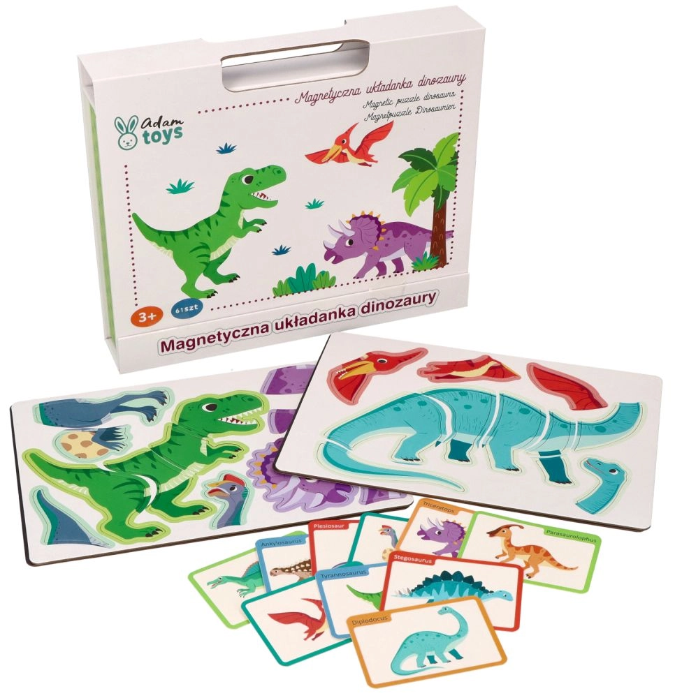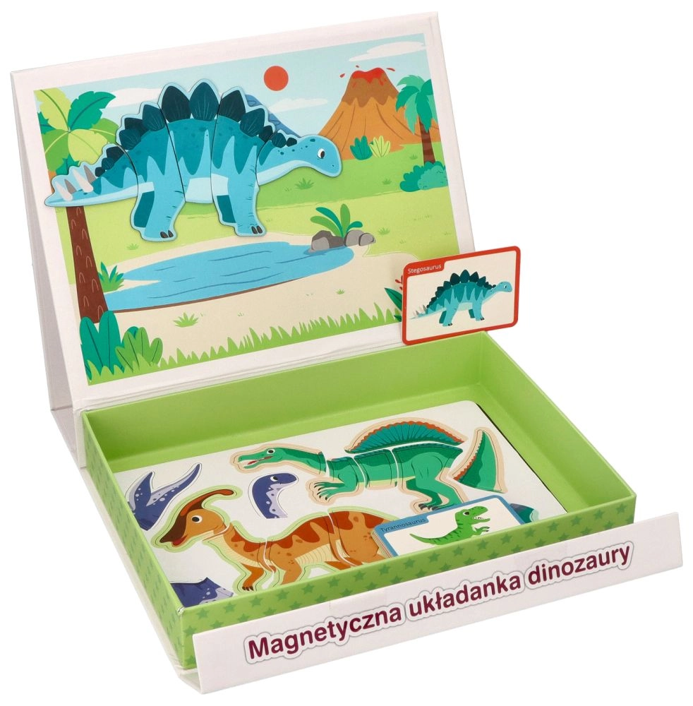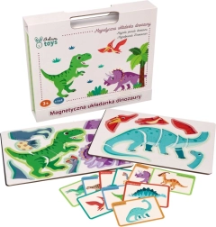 Περιεχόμενο συσκευασίας: μαγνητική επιφάνεια 26 × 19 εκ., 10 πολύχρωμες κάρτες με απεικονίσεις και ονομασίες δεινοσαύρων και 51 μαγνητικά κομμάτια για συναρμολόγηση. Το προϊόν είναι από ασφαλή υλικά και πληροί τα πρότυπα CE.
