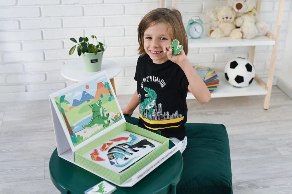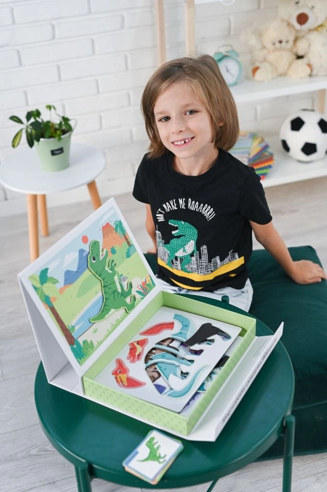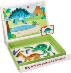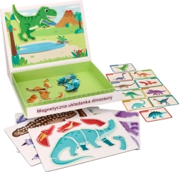 Ανακαλύψτε το μαγνητικό παζλ με δεινόσαυρους σε πρακτικό αναδιπλούμενο κουτί με λαβή, που προσφέρει στα παιδιά δημιουργική και διασκεδαστική μάθηση στο σπίτι και στο ταξίδι. Το σετ περιλαμβάνει 51 μαγνητικά κομμάτια και 10 πολύχρωμες κάρτες με είδη δεινοσαύρων – ιδανικό για την ανάπτυξη λεπτής κινητικότητας, συντονισμού χεριού–ματιού και λογικής σκέψης.