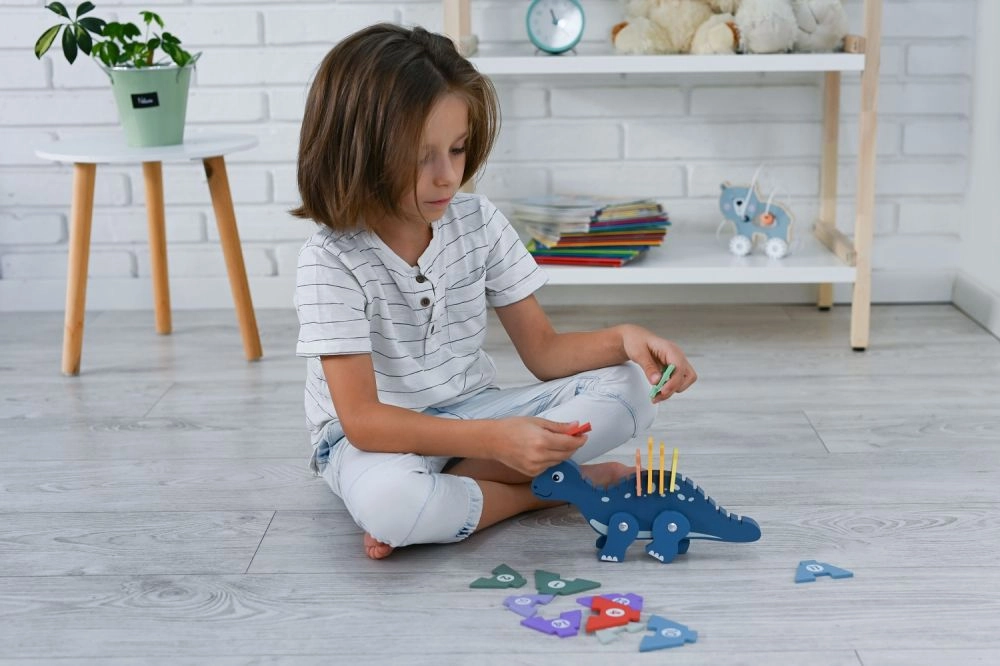 Το πολύχρωμο παζλ δεινοσαύρου βοηθά τα παιδιά να βελτιώσουν τις λεπτές κινητικές δεξιότητες και τον συντονισμό τους.