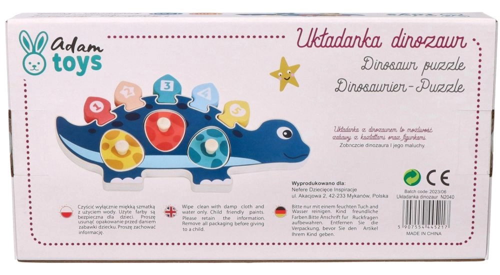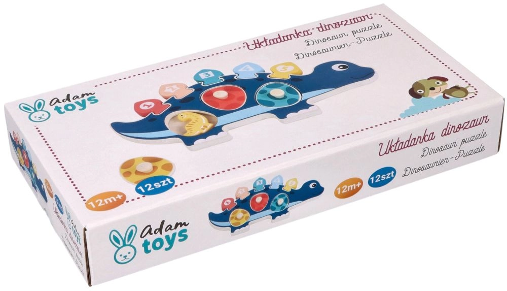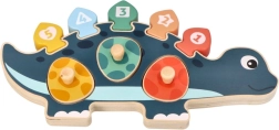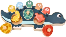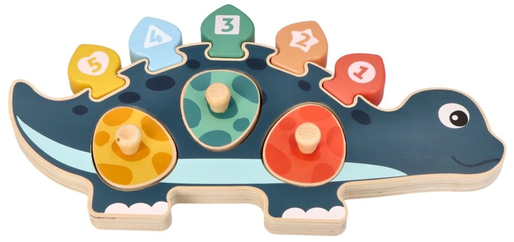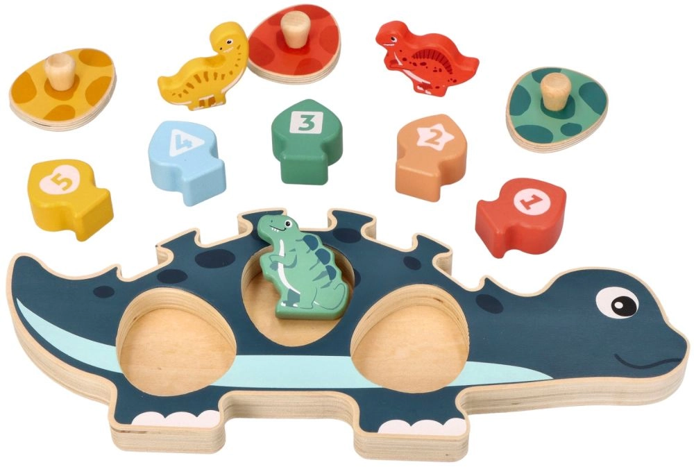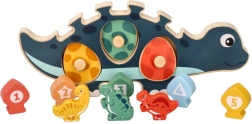Ξύλινο παιδικό παζλ σε σχήμα δεινοσαύρου με χρωματιστά αριθμημένα κομμάτια, ιδανικό για την ανάπτυξη της λεπτής κινητικότητας και των αριθμητικών δεξιοτήτων παιδιών από 12 μηνών.