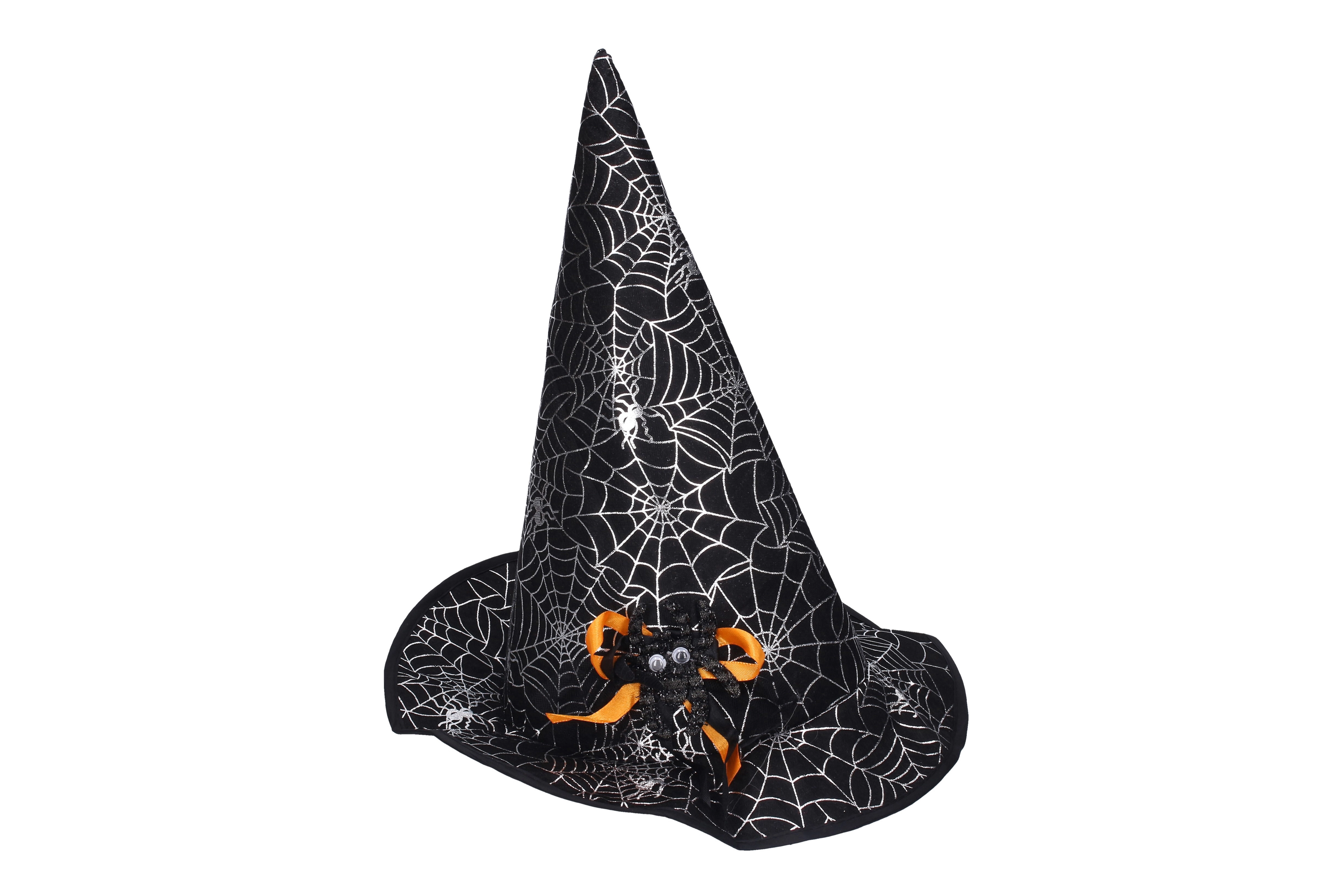 Όμορφο μαύρο καπέλο με αράχνη και ασημένιους ιστούς αράχνης, ιδανικό αξεσουάρ για όλους τους μικρούς μάγους.